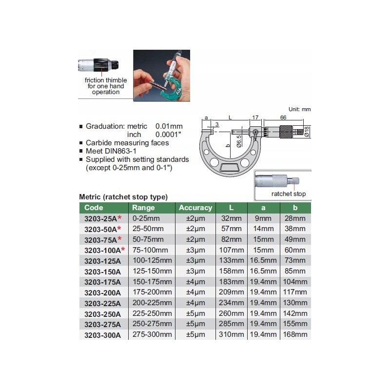 - Gehärtete Spindel und Anlagescheibe mit flachen Messflächen, versehen mit Hartmetall-Aufsätzen, die die Härte und Haltbarkeit der Messflächen erhöhen.