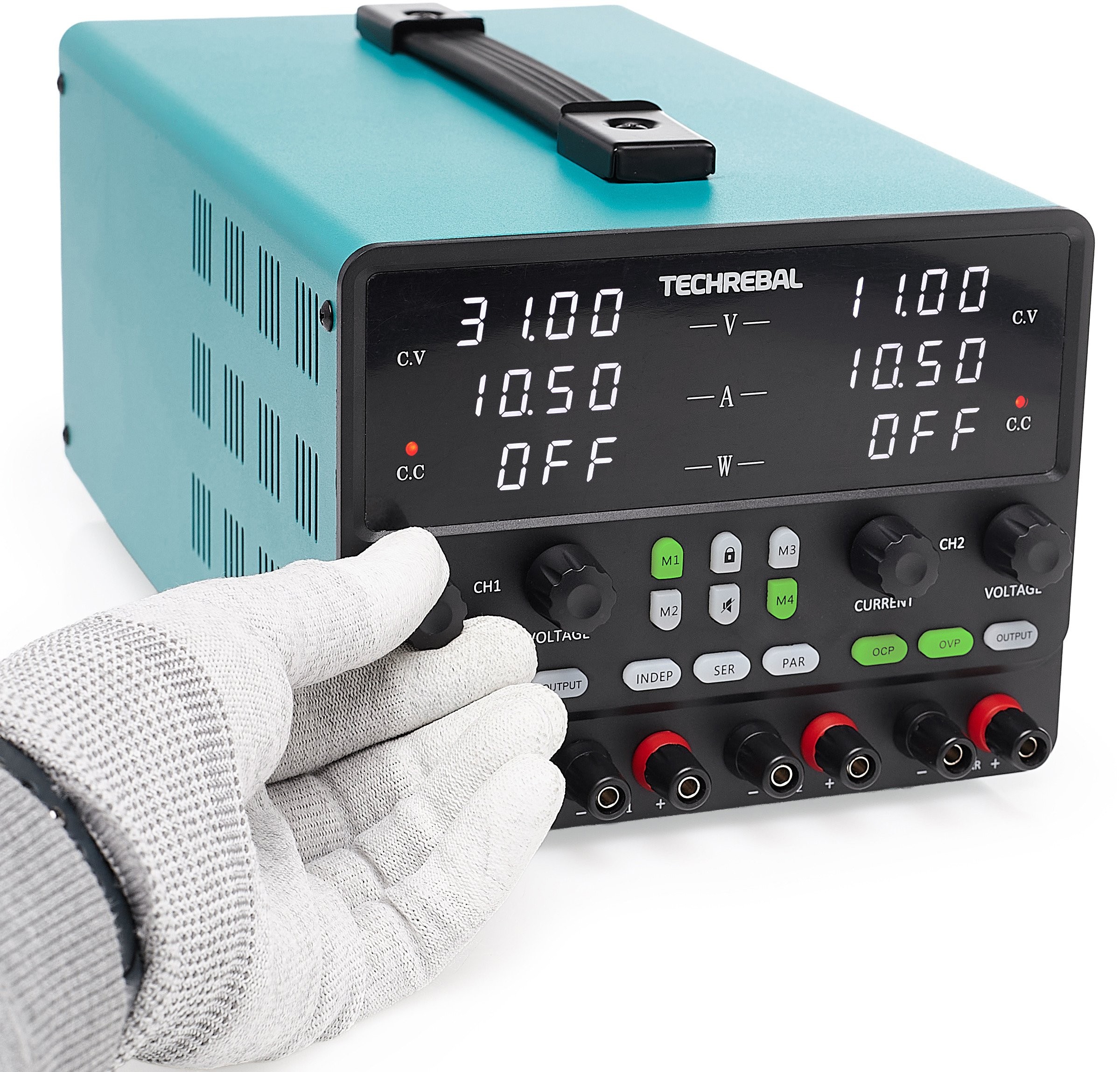 Das integrierte LED-Display ermöglicht die gleichzeitige Überwachung von Spannung, Strom und Leistung für beide Kanäle, was die Arbeit erheblich erleichtert und eine schnelle Anpassung der Einstellungen ermöglicht. Darüber hinaus ermöglicht die Speicherfunktion (Tasten M1–M4) das schnelle Abrufen von vier ausgewählten Konfigurationen.