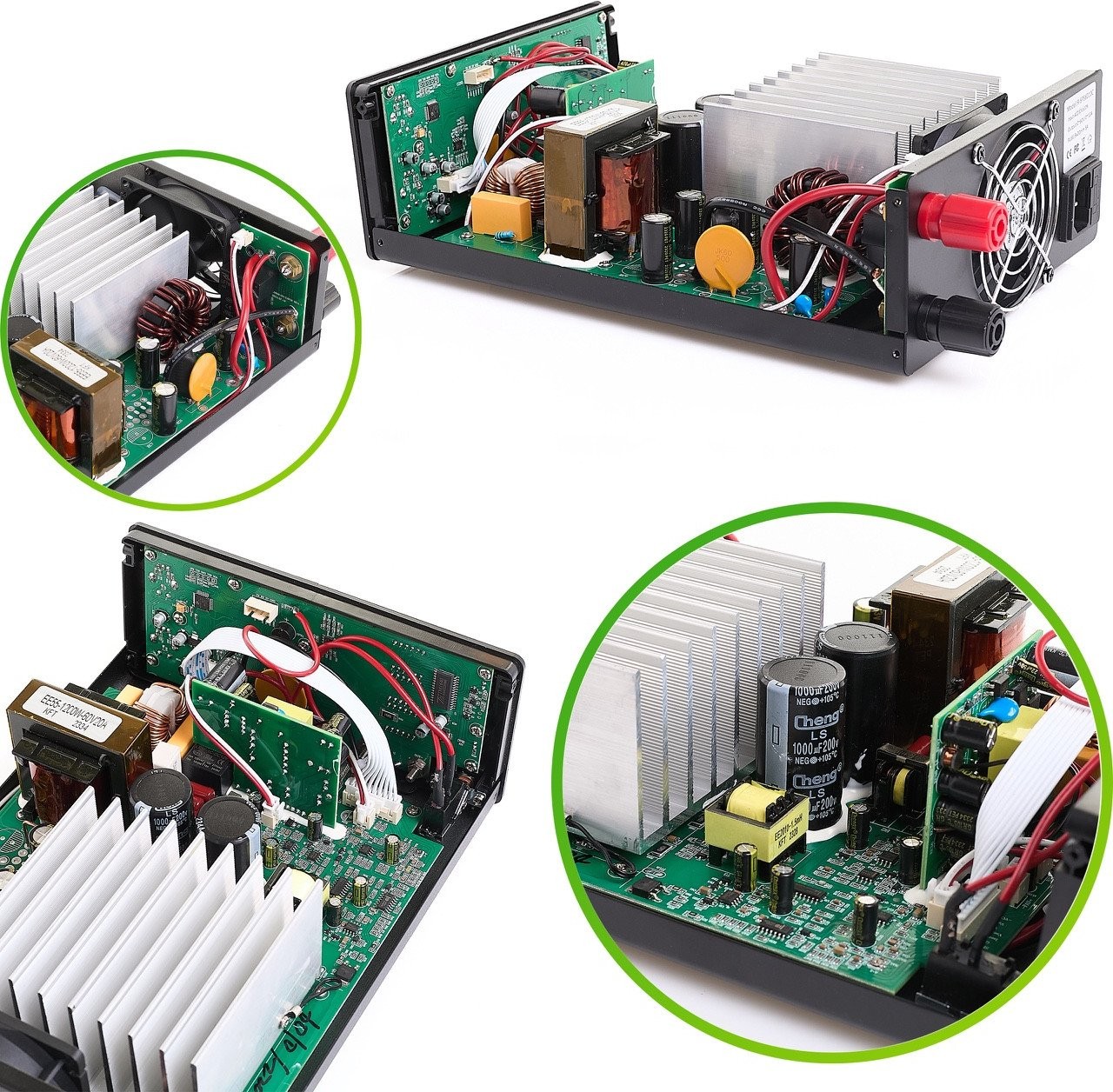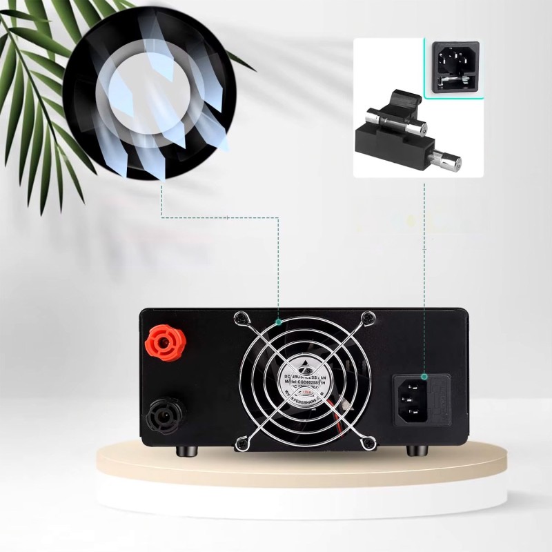 Das Gerät zeichnet sich durch ein robustes Metallgehäuse und Gummifüße aus, die für Stabilität auf Werkbankplatten sorgen. Das Netzteil wird durch einen leisen Lüfter gekühlt, der bei steigender Temperatur automatisch anspringt, was einen lang andauernden Betrieb ohne Überhitzungsgefahr ermöglicht.