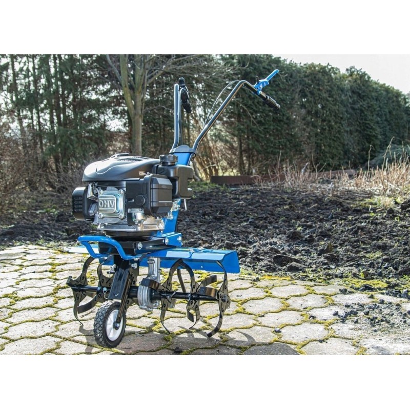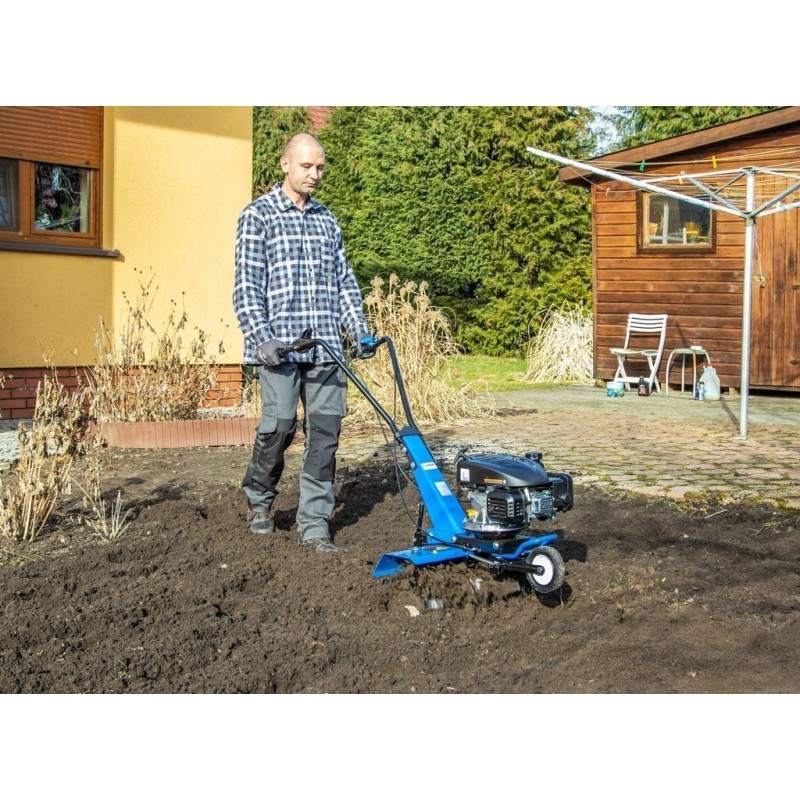 Der Bodenfräse ist mit einem verstärkten 4-Takt-Motor mit 139 cm³ Hubraum und einer maximalen Leistung von 5 PS ausgestattet, dank dem wir sicher sein können, dass uns bei der Gartenarbeit nicht die Kraft ausgeht.