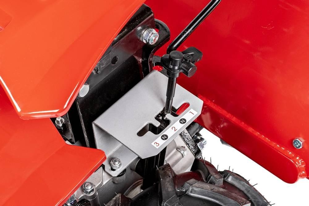 Der Motorhacke verfügt über Transporträder, die das Bewegen erleichtern, sowie über eine höhenverstellbare Steuerhebel, mit der die Höhe an die Körpergröße des Benutzers angepasst werden kann.