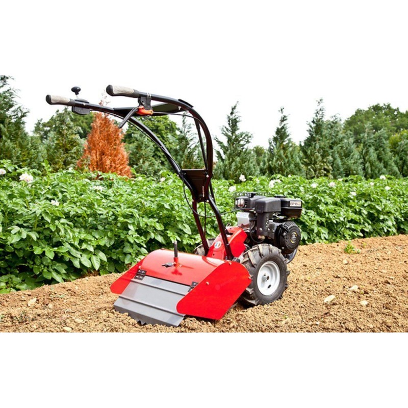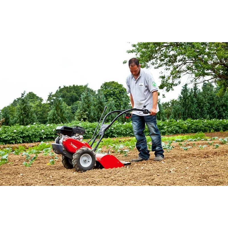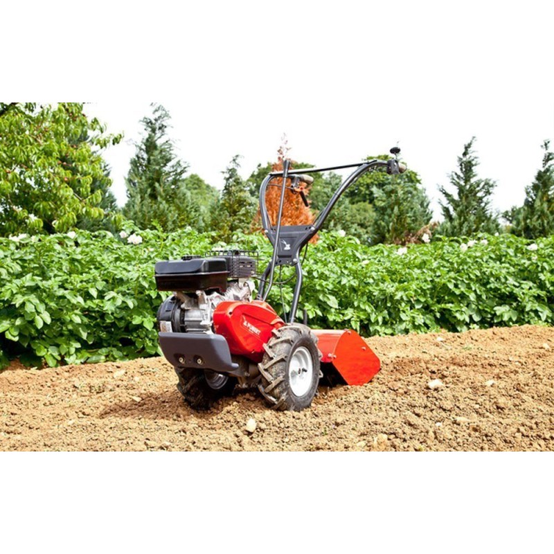 Ideal für die regelmäßige Bodenpflege, mit der Möglichkeit, große Flächen bei konstanter Arbeitstiefe zu bearbeiten. Unabhängig von der Bodenart ist die Führung der Bodenfräsen der Serie 400 leichtgängig und flexibel. Die benzinbetriebenen Bodenfräsen der Pubert®-Serie 400 wurden für den Einsatz unter allen Bedingungen und auf jedem Bodentyp entwickelt. Der Motorhacke kann auf Flächen von bis zu 2500 Quadratmetern eingesetzt werden. Ausgestattet mit 2 Vorwärtsgängen (1 für den Einsatz, 1 für den Transport) + 1 Rückwärtsgang verfügt der ROTO 408 über ein zuverlässiges japanisches Getriebe, das Langlebigkeit, Leistung und volle Zufriedenheit garantiert! Für vollständige Kontrolle und Anpassung an jede Bodenart drehen sich alle Zinken in die gleiche Richtung wie die Räder. Der Motorhacke ROTO 408 mit Honda GP160-Motor garantiert die hohe Leistung, die für den Einsatz unter allen Bedingungen erforderlich ist, bei geringen Investitionskosten. Der Griff kann an die eigenen Bedürfnisse angepasst werden. Der Benzin-Motorhacke ROTO 408 verfügt zudem über eine seitliche Verstellmöglichkeit, die es dem Benutzer ermöglicht, während des Pflügens seitlich neben der Maschine zu bleiben (ohne Gefahr, den bearbeiteten Boden zu zertrampeln oder bei Arbeiten in der Nähe von Wänden, Hecken oder Zäunen).