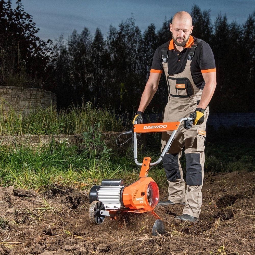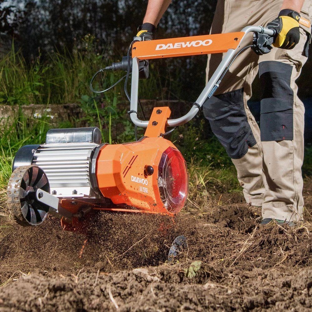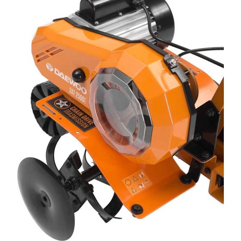 Der Motorhacke DAT 2500E ist mit einem elektrischen Induktionsmotor und geschmiedeten, gebogenen Messern ausgestattet, wodurch sie selbst mit schwerem Boden zurechtkommt. Das Gerät verfügt über ein zerlegbares Kettengetriebe, das bis zu 100 % des Drehmoments des Motors auf die Messer überträgt. Das Transportrad ermöglicht einen einfachen Transport des Geräts zwischen den Arbeitsbereichen. Die elektrische Motorhacke der Marke Daewoo ist für die Bodenlockerung und das Ausbringen von Dünger in Hausgärten vorgesehen. Der elektrische Motorhacke DAT 2000E zeichnet sich durch hohe Arbeitsleistung aus. Dank des Elektromotors ist das Gerät leicht und funktional; die kompakte Bauweise macht die Handhabung einfach und erfordert keinen großen Kraftaufwand seitens des Benutzers. Geräte der Marke DAEWOO stehen für Anwender auf der ganzen Welt für komfortables und sicheres Arbeiten zu Hause, im Garten, in der Garage oder in der Werkstatt. Das Erfolgsgeheimnis der Marke liegt in ihrem kompromisslosen Anspruch an Qualität und technisches Niveau der Produkte sowie in ihrem Bestreben, die Bedürfnisse, Wünsche und Erwartungen der Kunden in jedem Winkel der Welt zu erfüllen. Mit der Wahl von DAEWOO-Produkten schließen Sie sich einer millionenstarken Verbrauchergemeinschaft der neuen Generation an, die auf rationale Entscheidungen setzt, ihre Zeit und ihr Geld schätzt und den neuesten Trends in Technologie und Design folgt. Der elektrische Motorhacke DAT 2500E der Marke DAEWOO ist ein Gerät mit hoher Leistung. Die Arbeitsbreite der Maschine beträgt 55 cm. Der Motorhacke ist ein unersetzliches Gerät zum Umgraben, Auflockern und Einebnen des Bodens. Er eignet sich sowohl für große als auch für kleine Gärten. Die Arbeitsweise dieses Geräts besteht darin, Erdstücke abzuschneiden und nach hinten auszuwerfen. Damit bereiten wir den Boden für die Rasensaat vor oder mischen Dünger mit dem Boden. Das Gerät verfügt über einen 2000-W-Elektromotor, wodurch der Motorhacke reibungslos und leistungsstark arbeitet. Die maximale Arbeitstiefe beträgt 24 cm. Außerdem verfügt das Gerät über Annehmlichkeiten wie einen bequemen Griff mit weicher Ummantelung sowie eine einfache Hebe- und Senkfunktion der Räder für den Transport des Motorhackers.