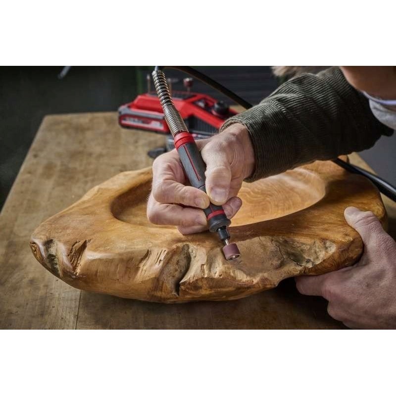 Das Akku-Schleif- und Gravurwerkzeug TE-MT 18/34 Li-Solo der deutschen Marke Einhell ist Teil der leistungsstarken Einhell Power X-Change-Familie, die für kabellose Freiheit und maximale Flexibilität steht. Es eignet sich ideal für viele verschiedene Arbeiten wie Gravieren, Polieren, Fräsen, Schleifen, Schneiden und Bürsten. Die Elektronik mit stufenloser Drehzahlregelung ermöglicht es, die Leistung an jede Situation und jedes Material anzupassen – bei Drehzahlen von 5.000 bis 34.000 Umdrehungen pro Minute. Der Feststellknopf ermöglicht einen schnellen und einfachen Werkzeugwechsel. Präzise Ergebnisse, selbst bei detailreichen Aufgaben oder komplexen Gravuren, sind dank des 92 cm langen Schafts auf einer flexiblen Welle möglich. Der Gravurstift liegt dank seiner schlanken Bauweise mit weichen Griffflächen perfekt in der Hand. Die Schleif- und Gravurstation ist mit einer praktischen Halterung für Schaft und Stichel sowie einer Halterung für häufig verwendete Zubehörteile und einer abnehmbaren Zubehörbox am Gehäuse ausgestattet. Je nach Aufgabe kann die Station mit einem 150 cm langen Gurt direkt am Körper getragen, platzsparend mit einer Wandhalterung aufgehängt oder dank gummierter Füße sicher auf dem Boden aufgestellt werden. Mit Hilfe eines Verriegelungsknopfes lassen sich verschiedene Zubehörteile und Werkzeuge einfach und schnell austauschen. So kannst du flexibel zwischen Arbeiten wie Gravieren, Schleifen, Schneiden oder Polieren wechseln.