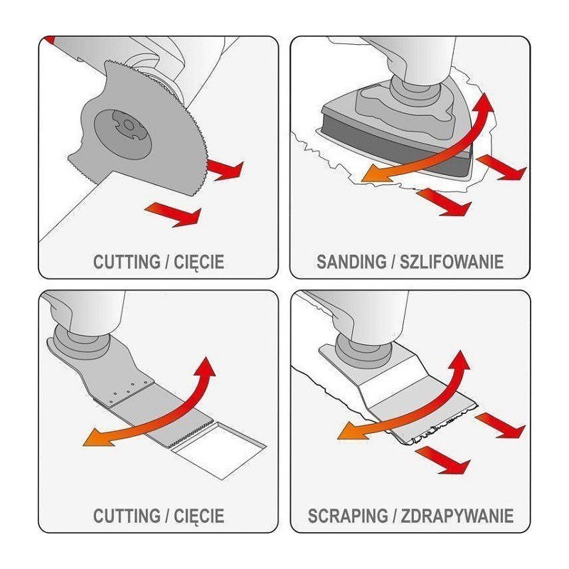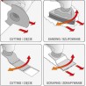 • Es dient zum Schneiden, zum Einstechen ohne Vorbohren, zum Schleifen an schwer zugänglichen Stellen sowie zum Entfernen von Putz, Estrich, Klebstoffen und Anstrichen.