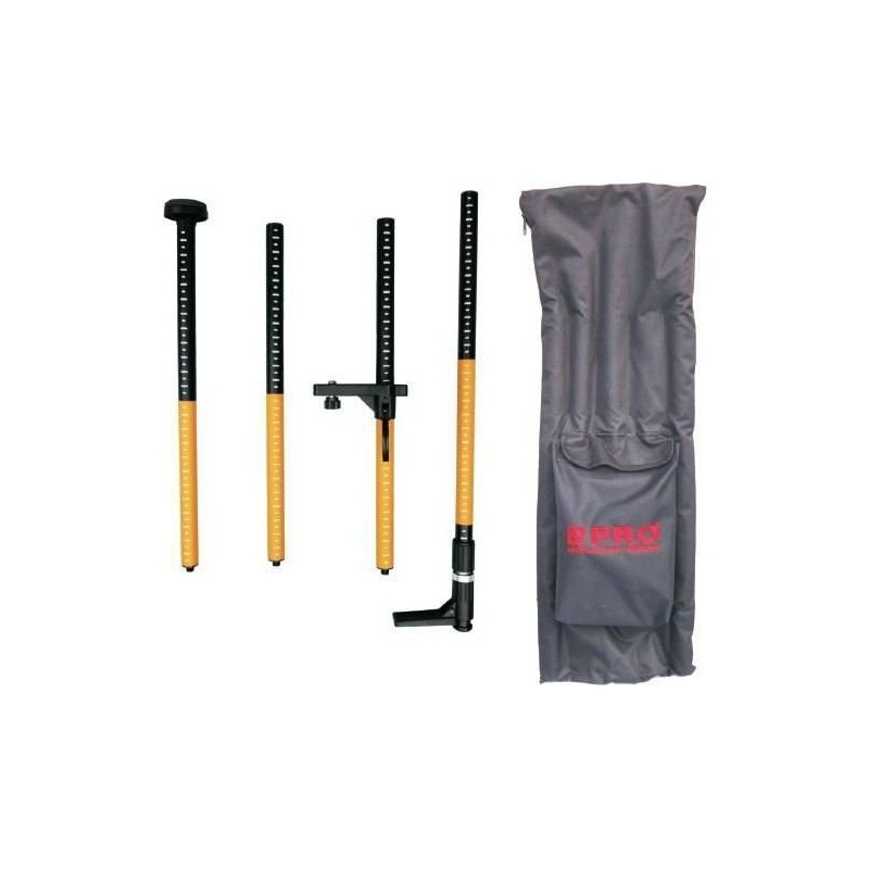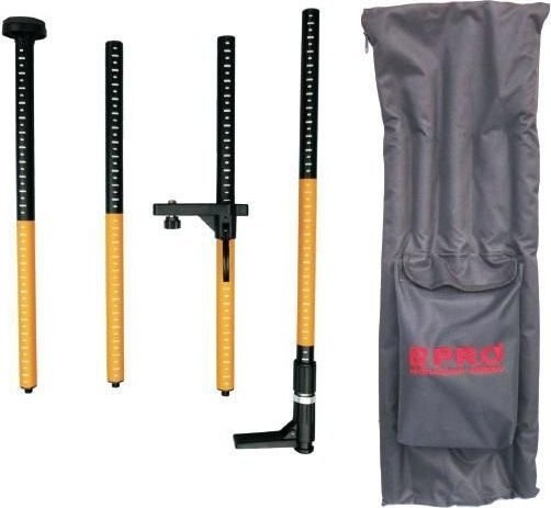 Lieferumfang: unteres Element der Stange in Teleskopbauweise, mit einem Fuß zum leichteren Verkeilen, mit einer oberen Spitze mit einer Bohrung für eine Schraube mit einem Durchmesser von 5/8" Verlängerungselemente für die Stange, an beiden Enden mit einem Gewinde versehen, das das Anschrauben des Elements an den unteren und oberen Teil der Stange ermöglicht (60 cm – 3 Stück, 30 cm – 1 Stück) bewegliche, universelle Halterung mit Messingschrauben mit Gewinden von 5/8” und 1/4”, zur Befestigung des Lasers an der Stange runder Sockel mit einem Durchmesser von 8 cm und einer Höhe von 4 cm, zur Befestigung der Stange zwischen Boden und Gewölbe
