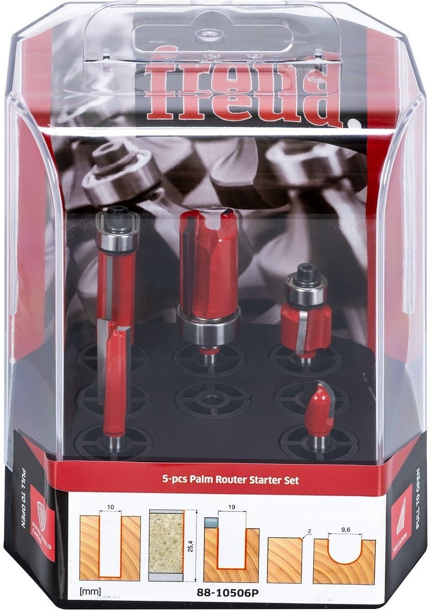 Das Fräserset „Palm Router Starter Set“ ist eine hervorragende Lösung für jeden Heimwerker, der bei der Holzbearbeitung professionelle Ergebnisse erzielen möchte. Dank der fünf verschiedenen Fräser deckt dieses Set die grundlegenden Anforderungen beim Fräsen von Nuten, Fasen und abgerundeten Kanten ab, was es zu einem unverzichtbaren Werkzeug in jeder Werkstatt macht.