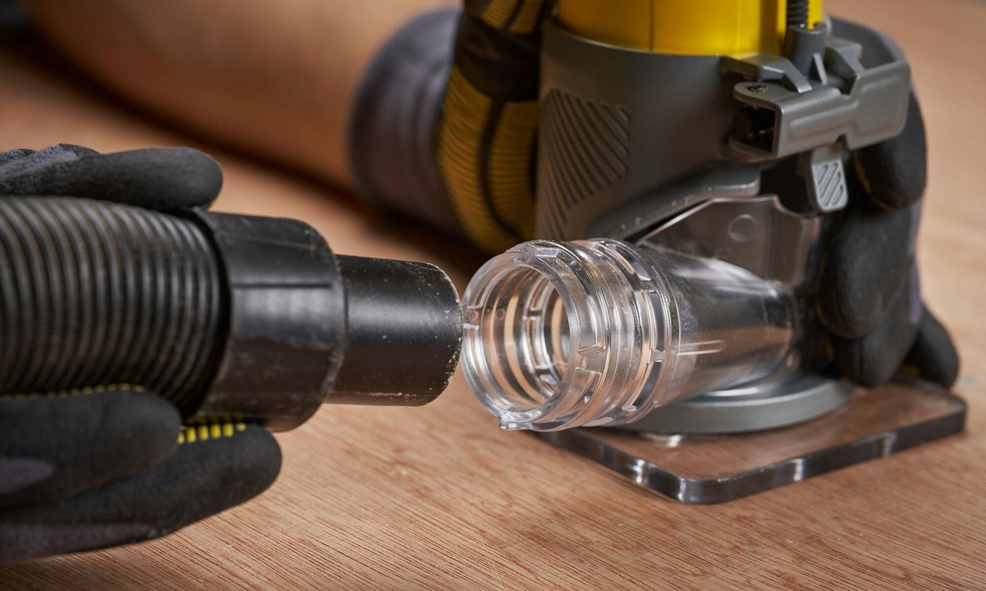 Die Fräsmaschine verfügt über einen Staubabsauganschluss, an den ein Staubsauger angeschlossen werden kann. So können Sie während der Arbeit einen sauberen und aufgeräumten Arbeitsplatz genießen, was für Komfort und Sicherheit äußerst wichtig ist.