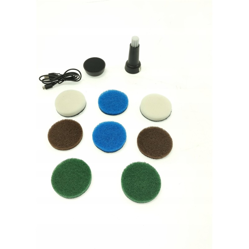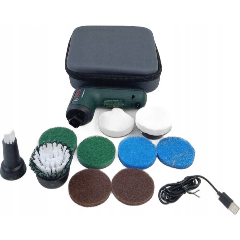 • Zubehörset: 2 Heavy-Duty-Pads, 2 Mikrofaser-Pads, 2 Melamin-Pads, 2 Küchenpads, Pad-Halter, breite Bürste, Präzisionsbürste, USB-Kabel zum Aufladen des Akkus, Etui aus strapazierfähigem Stoff.