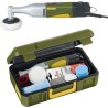 • Das Gerät wird in einem robusten Polypropylen-Koffer mit Zubehör geliefert: Gummischeibe mit Haken und Befestigungsschlaufe, Polierschaum (mittlere Härte), Polierscheibe aus Schafwolle, Polierfilz für Metall und Nichteisenmetalle (mittlere Härte), 12 Schleifscheiben K 2000 sowie NIGRIN-Polieremulsion (75 ml) sowie ein Mikrofasertuch.