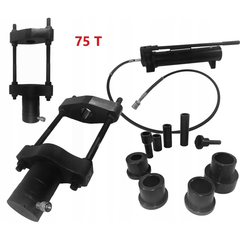 Professionelle 75-Tonnen-Hydraulikpresse zum Aus- und Einpressen von Bolzen ohne Demontage des Querlenkers, unverzichtbar bei Reparaturen an Lkw, Landmaschinen und anderen Werkstattarbeiten.