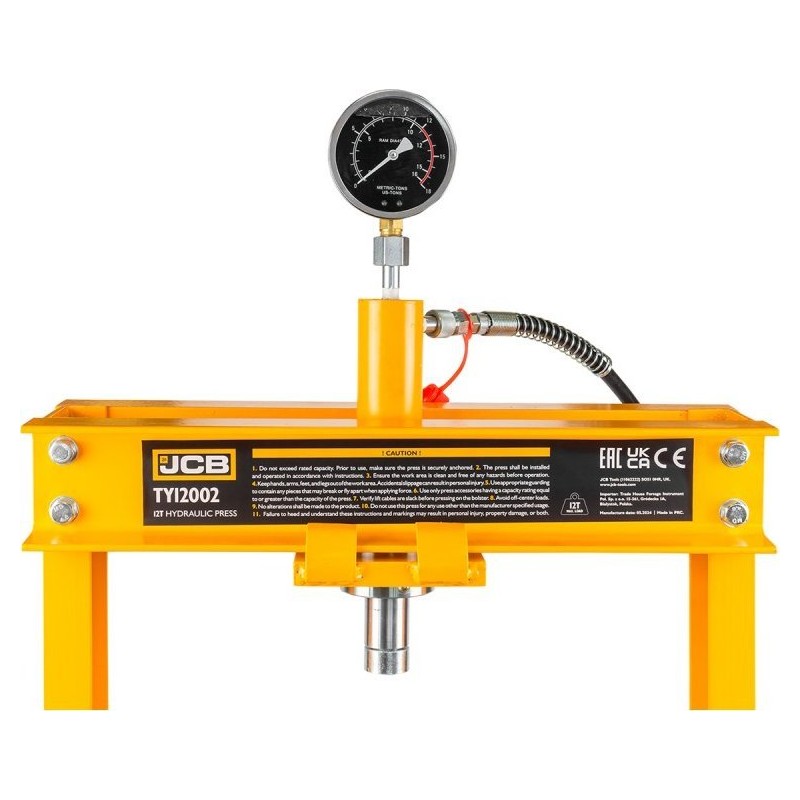 JCB Hydraulische Bodenpresse mit einer Tragkraft von 12 Tonnen, ausgestattet mit einem Manometer, ideal für vielfältige Anwendungen in Werkstätten und in der Industrie. Das Produkt besteht aus zwei Teilen, was Vielseitigkeit und einfache Handhabung gewährleistet.