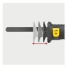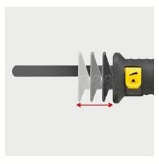 Praktische Sägeblattbefestigung mit Schnellwechselsystem für den werkzeuglosen Sägeblattwechsel. Zur Befestigung von Sägeblättern mit einseitigem Schaft. Sägeblatt mit nach unten gerichteter Zahnung oder um 180° nach oben gedreht, zum Sägen an engen und schwer zugänglichen Stellen.