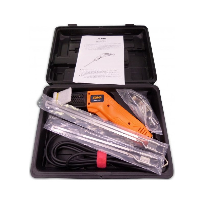 Der Edma-Heißschneider zeichnet sich durch eine hohe Leistung von 320 W und eine CE-Zertifizierung aus. Das Gerät wird in einem Kunststoffkoffer geliefert, was den Transport und die Aufbewahrung erleichtert.