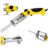 10062178 Das Styropor-Messer der Marke MSW eignet sich ideal für glatte Schnitte in der Gebäudedämmung oder zum Ausschneiden von Aussparungen für Rohre sowie für kleine Schnitte im Modellbau. Es eignet sich für Schnitte in Dämmstoffen wie expandiertem Polystyrol (EPS) oder extrudiertem Polystyrol (XPS); dazu muss lediglich die Temperatur (in fünf Stufen) im Bereich von 70 bis 450 °C eingestellt werden. Das Messer verfügt über eine Schnitttiefenverstellung bis zu 95 mm und ermöglicht präzise und glatte Kanten in Styroporplatten. Für freie Schnitte steht eine Tiefe von 145 mm zur Verfügung. Der ergonomische Griff sorgt für Sicherheit bei der Anwendung, und das 2 m lange Kabel bietet große Bewegungsfreiheit. Das Messer ist kompakt, leicht und robust, und eine Kontrollleuchte zeigt an, ob es eingeschaltet ist und Wärme erzeugt.