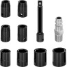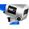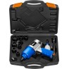 Das Gerät erreicht eine Drehzahl von bis zu 8000 U/min und ein Drehmoment von 700 Nm. Der Leistungsregler (3 Drehzahlen zum Anziehen, 1 zum Lösen) mit Vor-/Rückwärts-Einstellung ermöglicht die Anpassung der Drehzahl an die jeweilige Aufgabe. Mit dem Umschalter für Links- und Rechtslauf kann der Montage- oder Demontagemodus gewählt werden. Der Twin-Hammer-Schlagmechanismus sorgt für eine enorme Reißkraft, die bei größeren Fahrzeugen oder festsitzenden Schrauben nützlich ist. Der vordere Luftauslass sowie der ergonomische, rutschfeste und vibrationsdämpfende Griff ermöglichen komfortables Arbeiten. Ein umfangreiches Zubehörset bestehend aus Steckschlüsseln in verschiedenen Größen (12, 13, 14, 15, 17, 19, 22, 24 mm), einem 1/4"-Anschluss, einem Inbusschlüssel, einer Verlängerung und einer Ölflasche rundet die Ausstattung des Druckluftschraubers ab. Der Koffer schützt das gesamte Zubehör vor Beschädigungen.