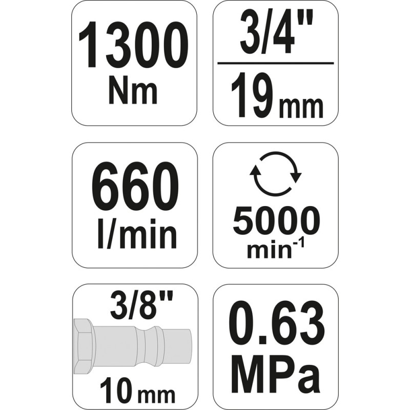 • Professioneller Druckluftschlüssel der Marke YATO. Antriebsgröße 3/4". Die maximale Drehmomentleistung bei einem Druck von 6 bar beträgt 1300 Nm
