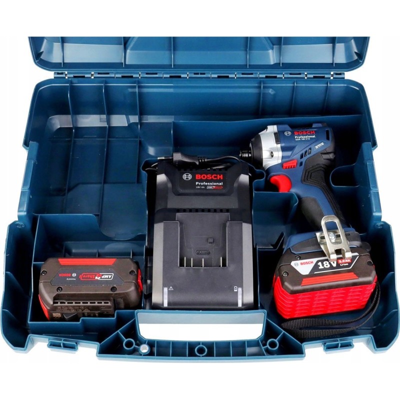 Im Lieferumfang des Schraubers sind zwei 18-V-Akkus mit einer Kapazität von 5,0 Ah, ein Schnellladegerät GAL 18V-40, eine Gürtelhalterung, ein Handgelenkband sowie ein Werkzeugkoffer enthalten, was den Transport und die Aufbewahrung erheblich erleichtert.