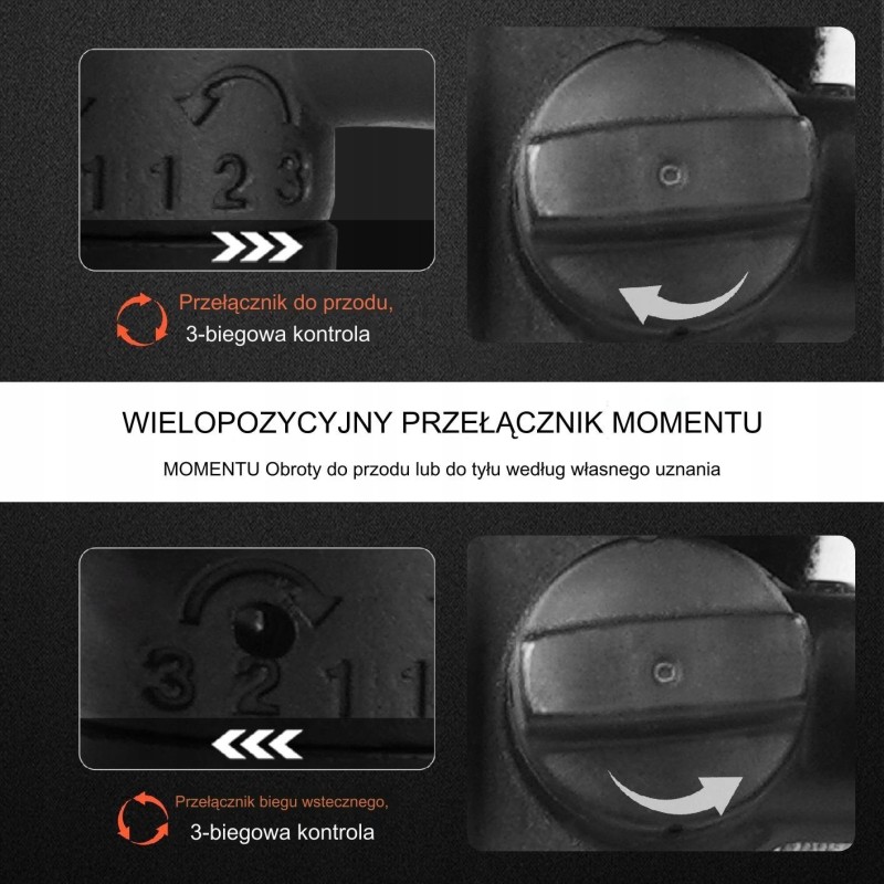 Kombinierter Vorwärts-/Rückwärts- und Leistungsschalter, 6-stufige Einstellungen zur Regelung von Drehzahl und Drehmoment zur Anpassung an verschiedene Anwendungen.