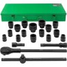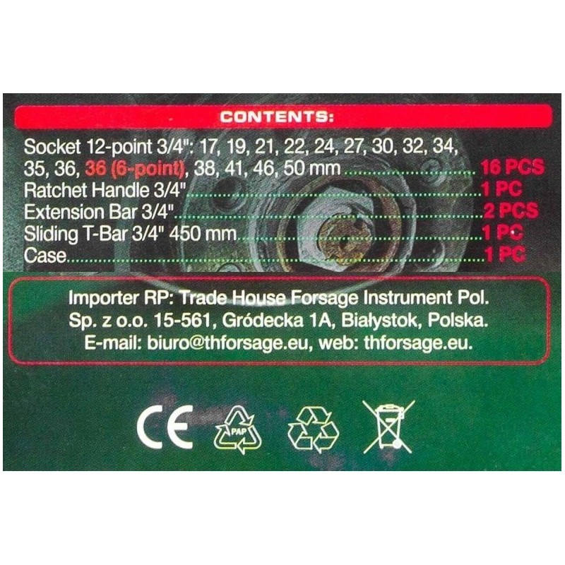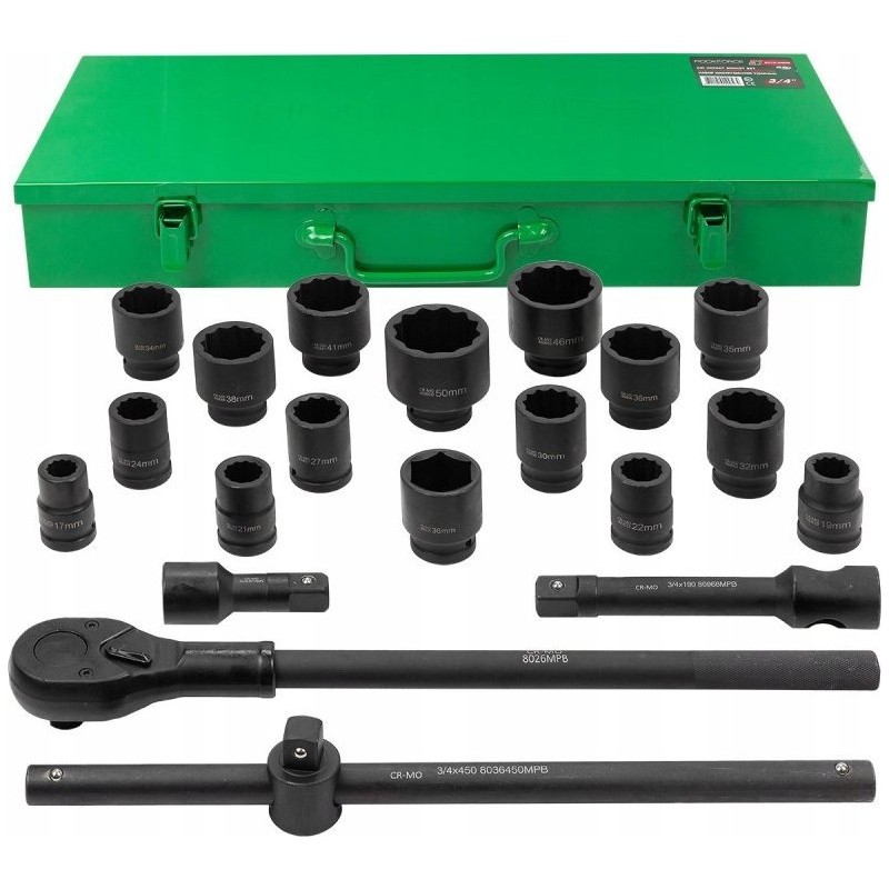 • 12-kant-Steckschlüsseleinsätze 3/4" – 15 Stück: 17, 19, 21, 22, 24, 27, 30, 32, 34, 35, 36, (36 mm – 6-kant), 38 mm, 41 mm, 46 mm, 50 mm;
