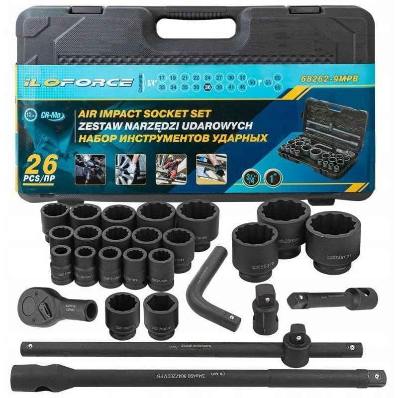 Das 26-teilige Schlagwerkzeugset ist die perfekte Lösung für alle, die bei der Arbeit Wert auf Qualität und Vielseitigkeit legen. Das Set ist für 3/4"- und 1"-Aufnahmen ausgelegt und bietet Steckschlüsseleinsätze in verschiedenen Größen von 17 mm bis 65 mm, was es zu einem unverzichtbaren Werkzeug in jeder Werkstatt macht.