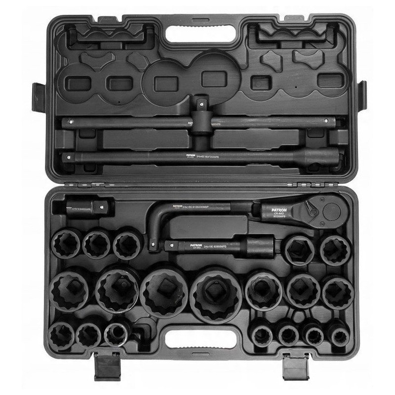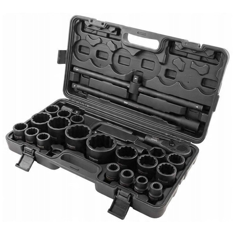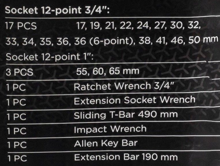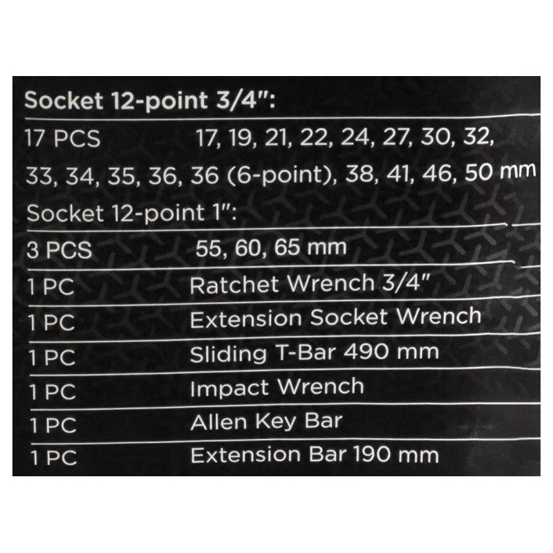 Das Set enthält Steckschlüssel mit 12-Kant-Form, was für eine bessere Passform und eine höhere Haltekraft sorgt. Die 3/4"-Steckschlüssel decken die Größen 17–50 mm ab, während die 1"-Steckschlüssel die Größen 55–65 mm abdecken, was sie ideal für die Arbeit mit verschiedenen Arten von Schrauben und Muttern macht.