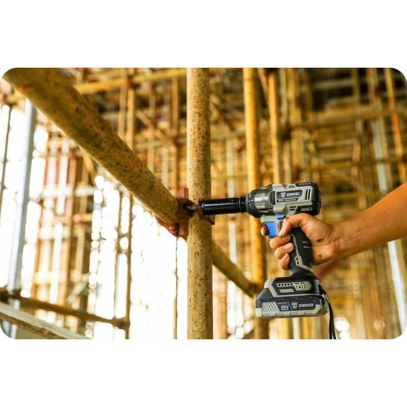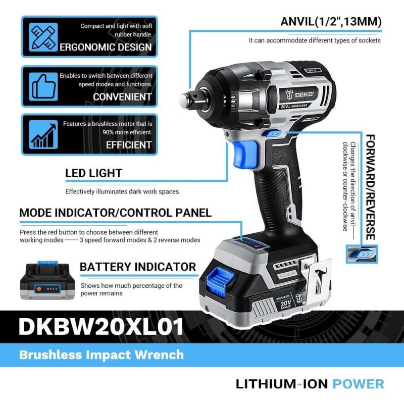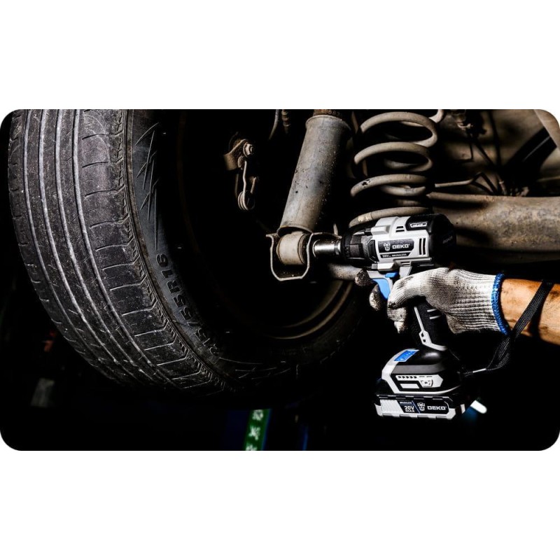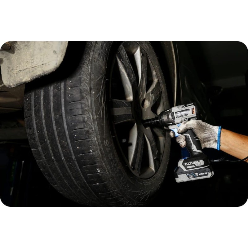 Mit einem Drehmoment von bis zu 350 Nm wurde der 20-V-Akku-Schlagschrauber DEKO DKBW20XL01 entwickelt, um verschiedene Befestigungsaufgaben einfach zu bewältigen. Der Schlagmechanismus sorgt für ein hohes Drehmoment bei geringer Rückkopplung über den Griff und bietet so mehr Komfort und Sicherheit.