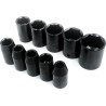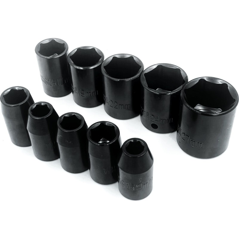 • Steckschlüsseleinsätze 1/2" – 10 Stück: 9 mm, 10 mm, 11 mm, 13 mm, 14 mm, 17 mm, 19 mm, 22 mm, 24 mm, 27 mm