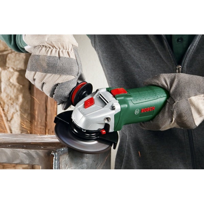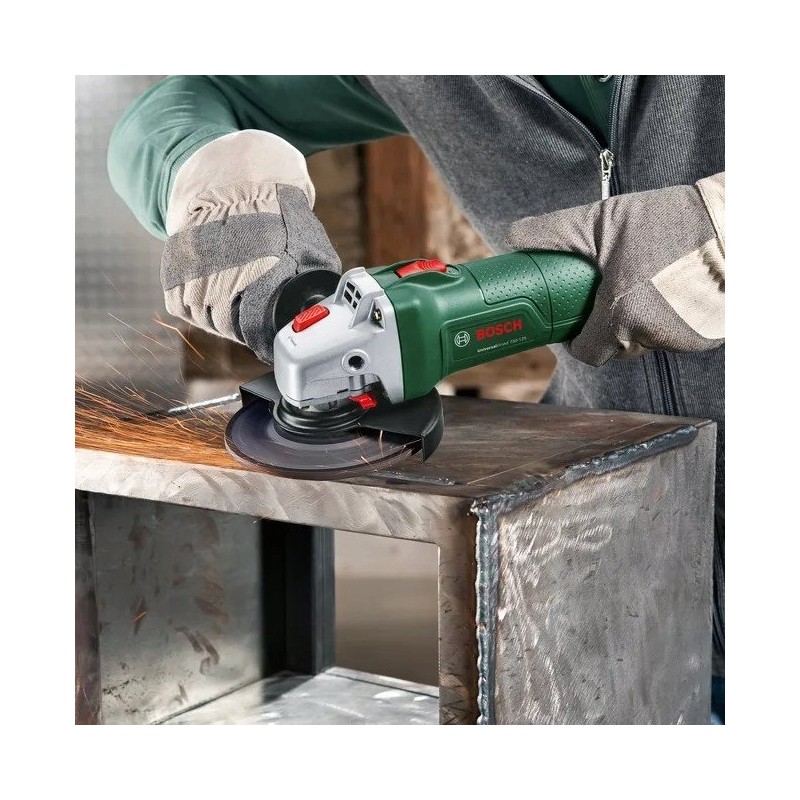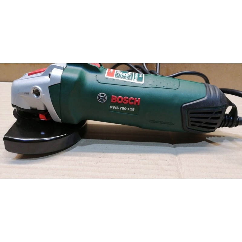 Dieses Gerät verfügt über einen Spindelarretierungsknopf (M14), der einen schnellen Scheibenwechsel ermöglicht. Wichtig: Für diese Halterung sind keinerlei Werkzeuge erforderlich! Sie verfügt über einige einfache Sicherheitsvorrichtungen, die Bedienung ist sehr einfach. Der Winkelschleifer BOSCH 750-115 ist für Scheiben mit einem Durchmesser von 115 mm ausgelegt. Dies ist einer der gängigsten Scheibentypen, sodass Zubehör dafür leicht erhältlich ist.