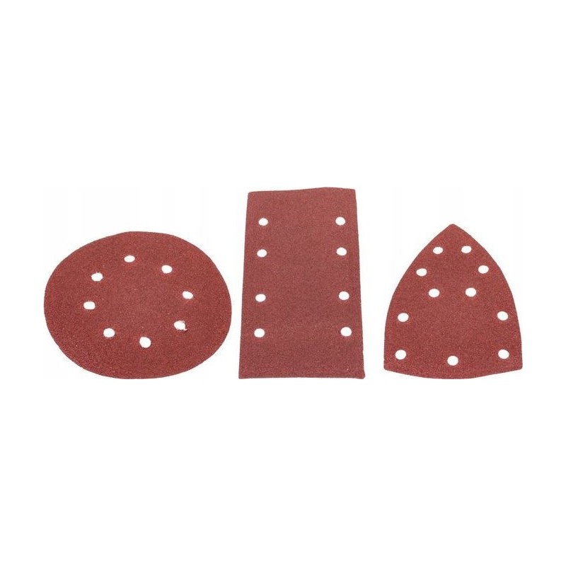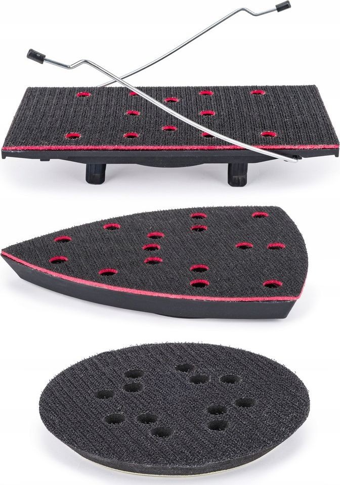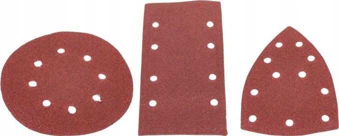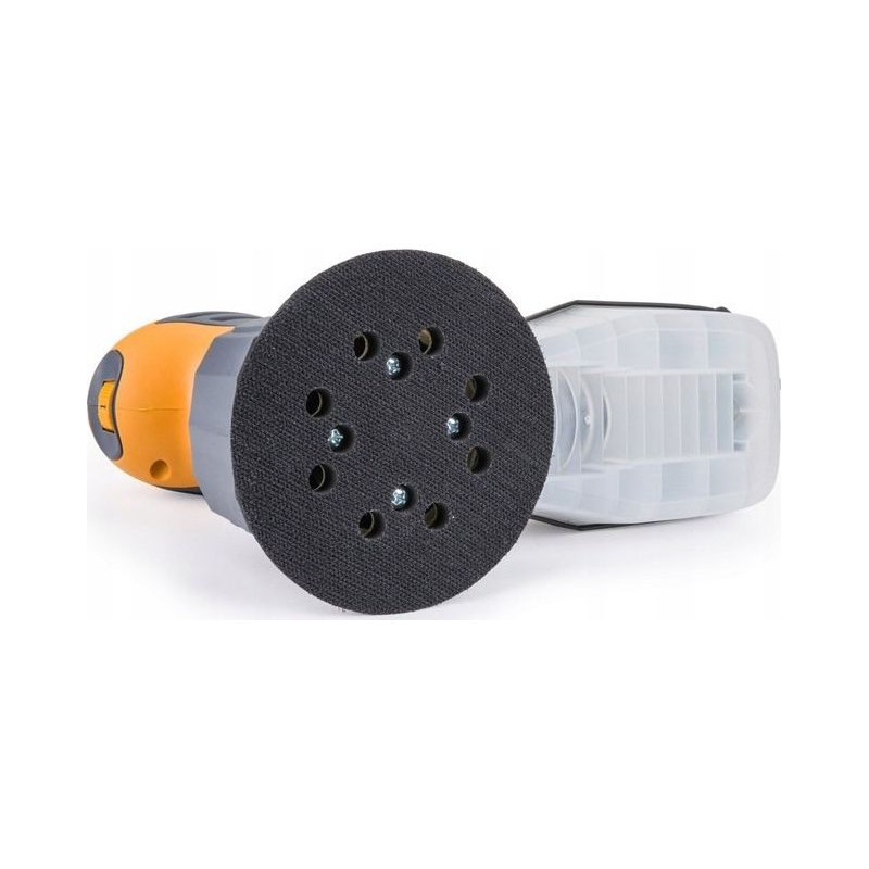 Das Gerät ist für Schleifmittel mit einem Durchmesser von 125 mm mit Klettbefestigung und acht Entstaubungslöchern ausgelegt. Das Zubehör umfasst 12 Schleifblätter – für jede Art von Schleifscheibe jeweils 2 in zwei Körnungen.