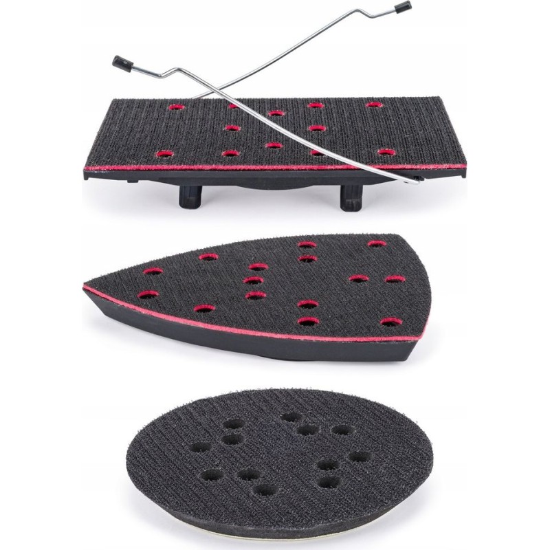 Für multifunktionales Schleifen – exzentrisch und oszillierend – bietet die Schleifmaschine die Möglichkeit, 3 verschiedene Schleifpads zu montieren (orbital – zum Schleifen flacher Oberflächen; dreieckig – zum Schleifen unebener Oberflächen; rechteckig – zum Schleifen von Ecken und Kanten).