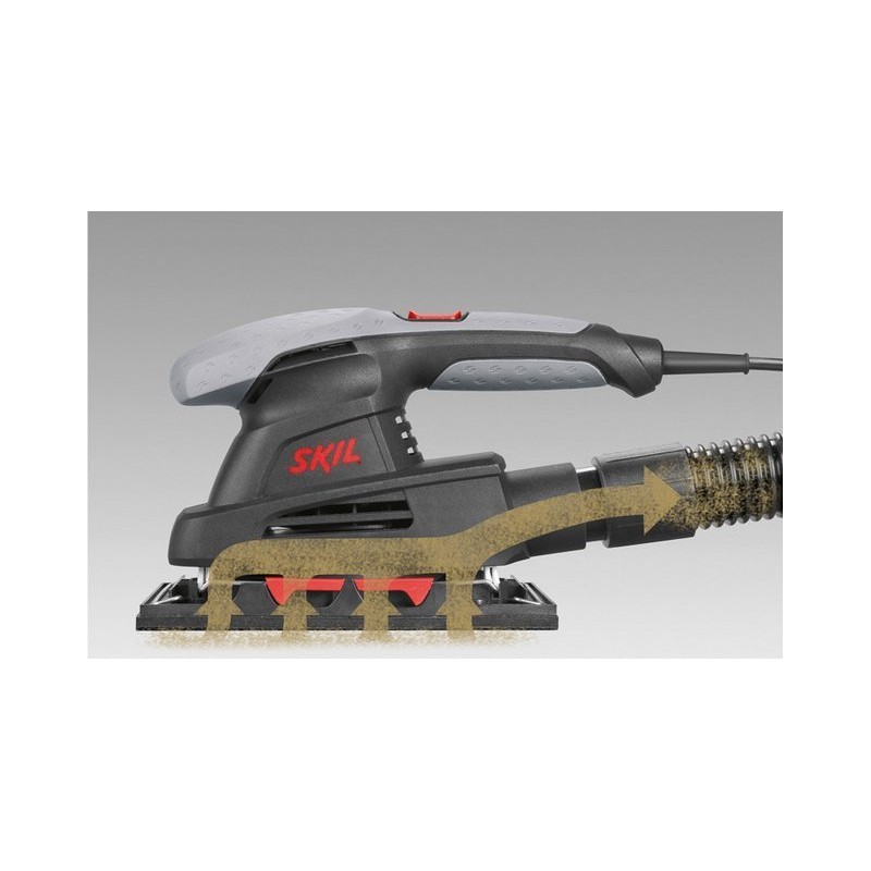 Die Schleifmaschine ist zudem mit einem Staubabsaugsystem ausgestattet – das sorgt für Sauberkeit während der Arbeit. Das SKIL-Staubabsaugsystem sorgt für eine effektive Absaugung des beim Schleifen verschiedener Materialien entstehenden Staubs