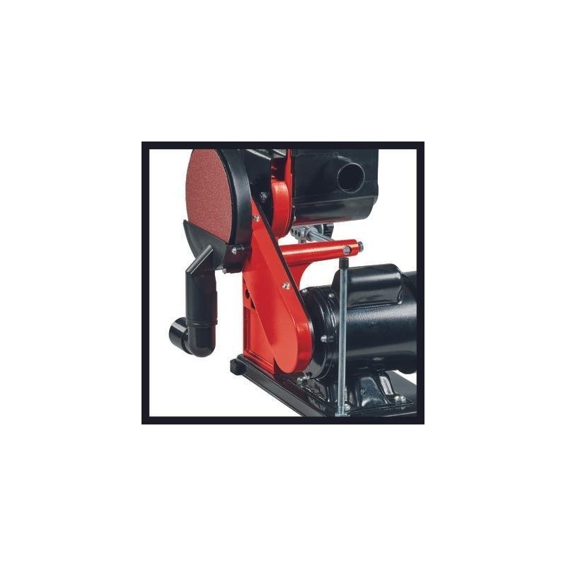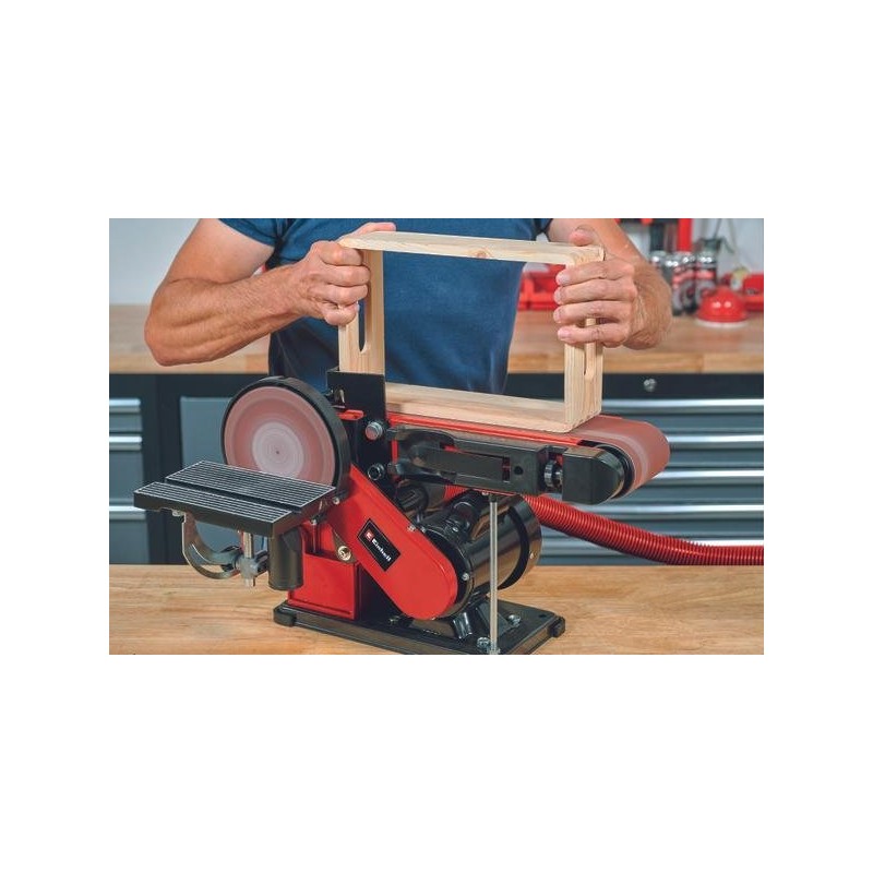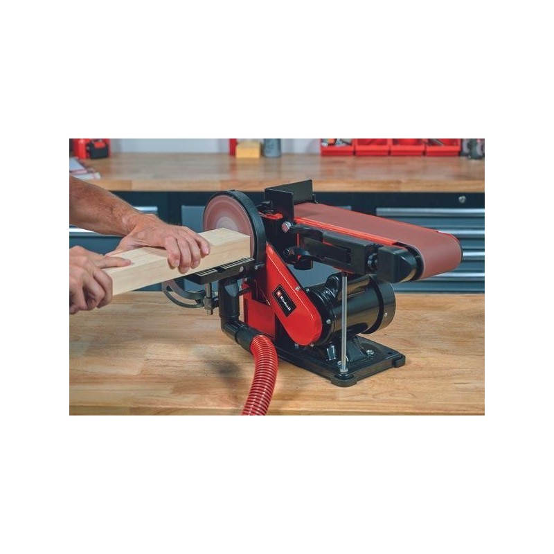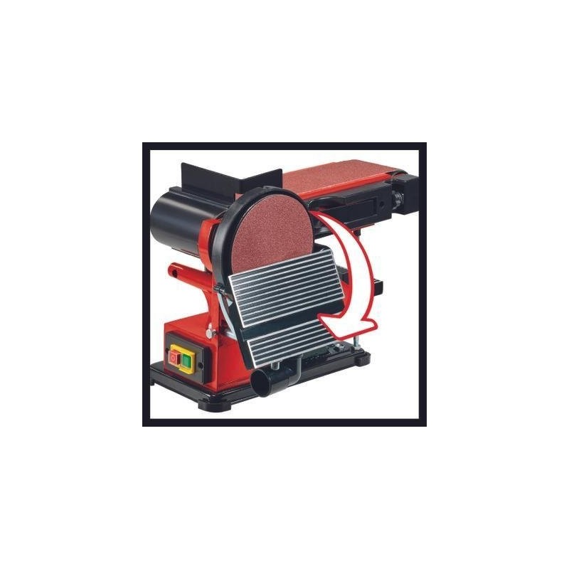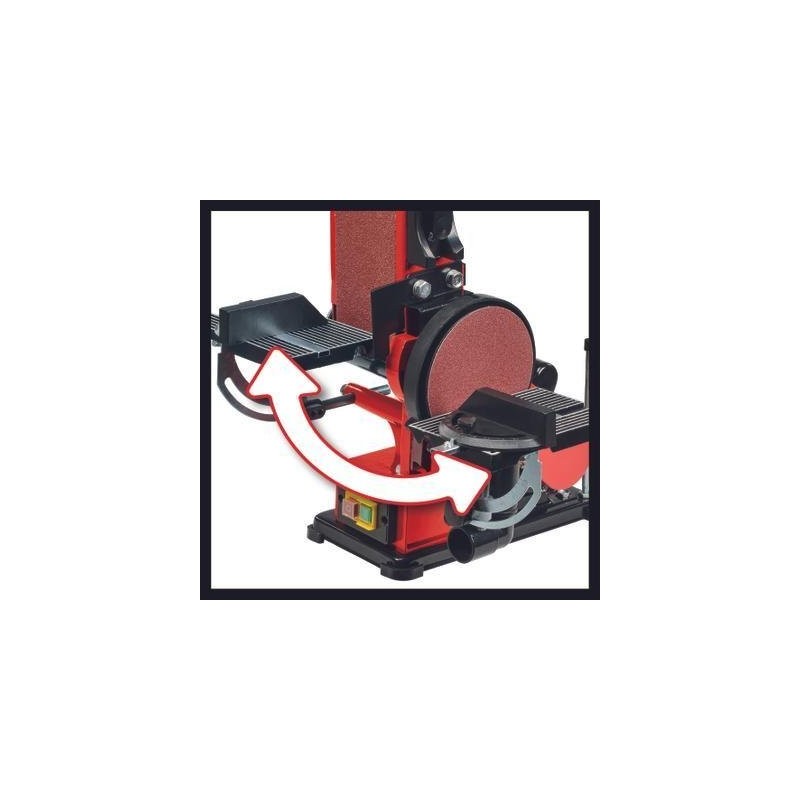 Die stationäre Band- und Tellerschleifmaschine Einhell TC-US 380 ist ein 380-W-Werkzeug mit Band- und Tellerschleiffunktion, ausgestattet mit einer drehbaren Schleifeinheit mit Werkstückanschlag. Die Spannvorrichtung ermöglicht einen einfachen und unkomplizierten Wechsel des Schleifbands, dessen Zentrierung von außen einstellbar ist. Die 150-mm-Scheibenschleifmaschine ist mit einem Klettverschluss ausgestattet, der einen schnellen Wechsel des Schleifbands ermöglicht. Der schwenkbare Aluminium-Auflagetisch ist stabil, kann für das Bandschleifen verwendet werden und ist mit einer gut ablesbaren Winkelskala für vielseitige Anwendungen ausgestattet. Der Queranschlag lässt sich zudem im Bereich von -60° bis +60°drehen. Vier stabile Gummifüße dämpfen Vibrationen und sorgen für einen stabilen und sicheren Stand. Die stationäre Bandschleifmaschine verfügt über einen Anschluss für die Staubabsaugung, um einen sauberen Arbeitsplatz zu gewährleisten. Im Lieferumfang enthalten sind 1x Schleifband und 1x Schleifpapier.