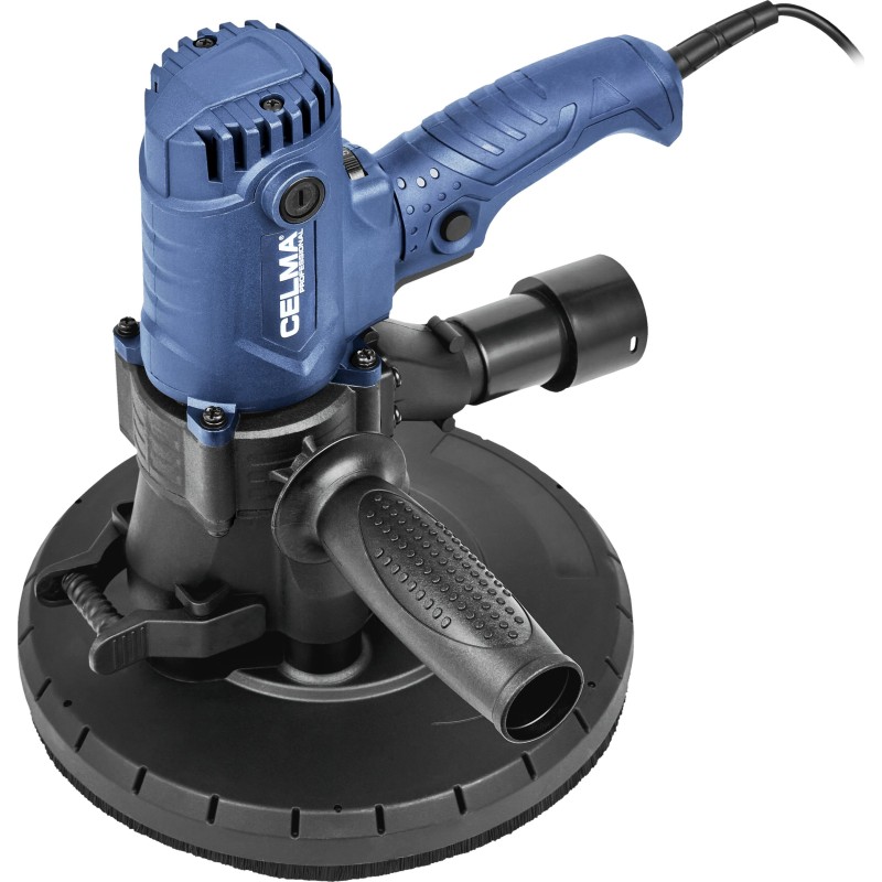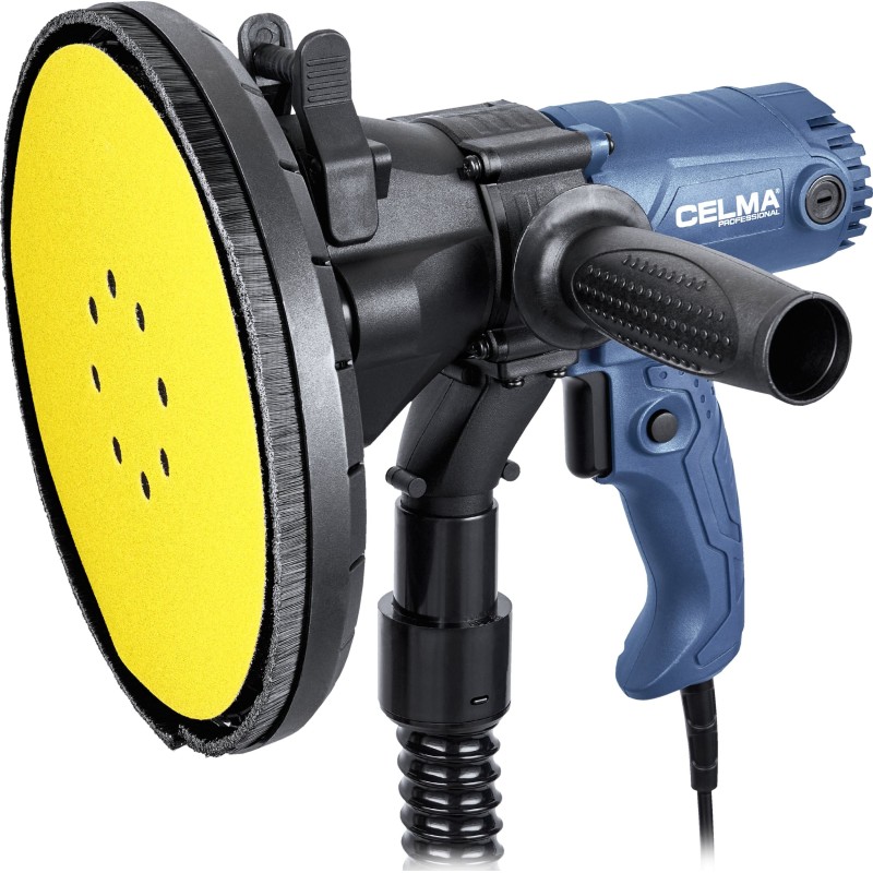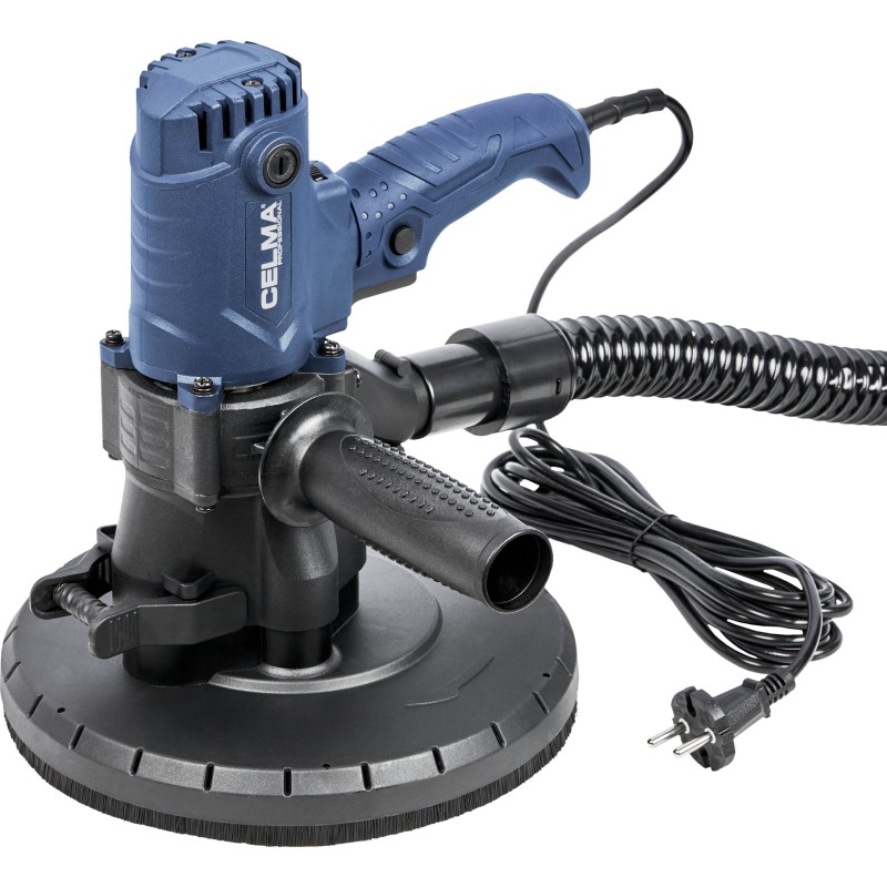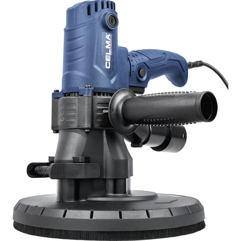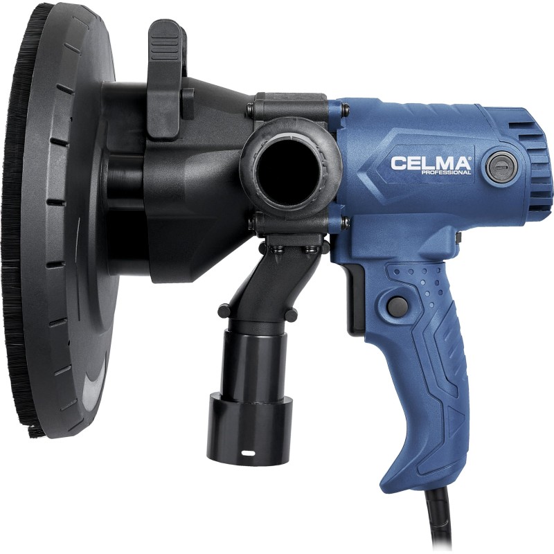 Die Gipsschleifmaschine CELMA Professional PRBs 225GEO ist zum Schleifen von Wänden und Decken aus Gipskartonplatten, Putz und Gipsspachtelmasse, zum Veredeln von Fugen zwischen Gipskartonplatten sowie zum Beseitigen kleiner Unebenheiten auf Putzoberflächen bestimmt. Sie bietet hohen Arbeitskomfort, eine hervorragende Oberflächenqualität und außergewöhnliche Mobilität dank ihres geringen Gewichts, der guten Gewichtsverteilung, der gut angeordneten Griffe sowie des 4 Meter langen Netzkabels. Die stufenlose Drehzahlregelung ermöglicht eine optimale Anpassung der Drehzahl an die jeweilige Arbeitsaufgabe. Das integrierte und leistungsstarke Absaugsystem sowie der im Lieferumfang enthaltene geräumige Staubbeutel ermöglichen das Arbeiten ohne Staubsauger. Um die Effizienz der Staubabsaugung von den bearbeiteten Oberflächen zu erhöhen, wird empfohlen, die Maschine an einen Industriestaubsauger anzuschließen, was durch den im Lieferumfang enthaltenen Adapter ermöglicht wird.