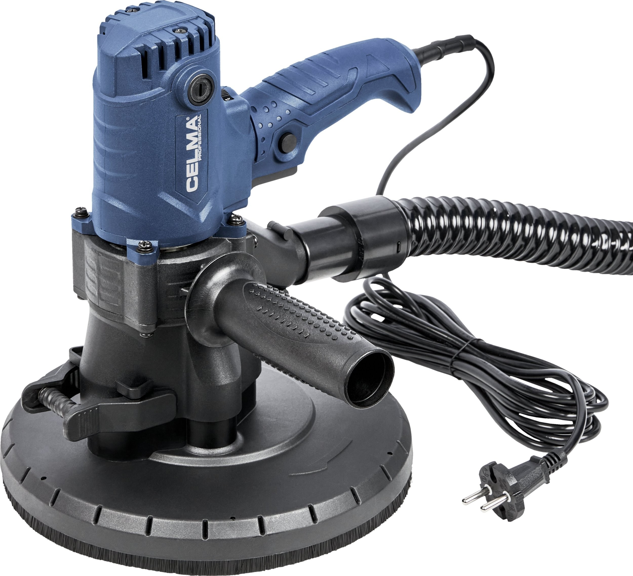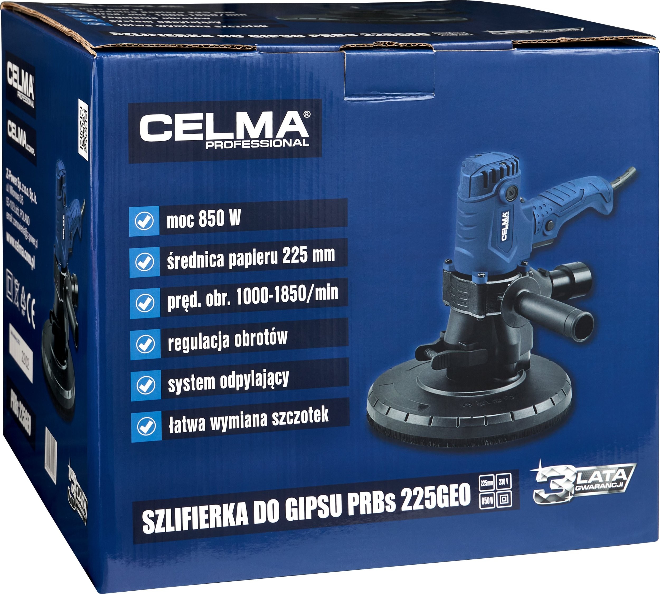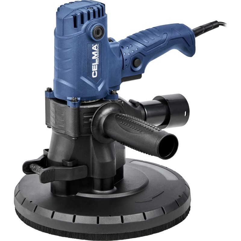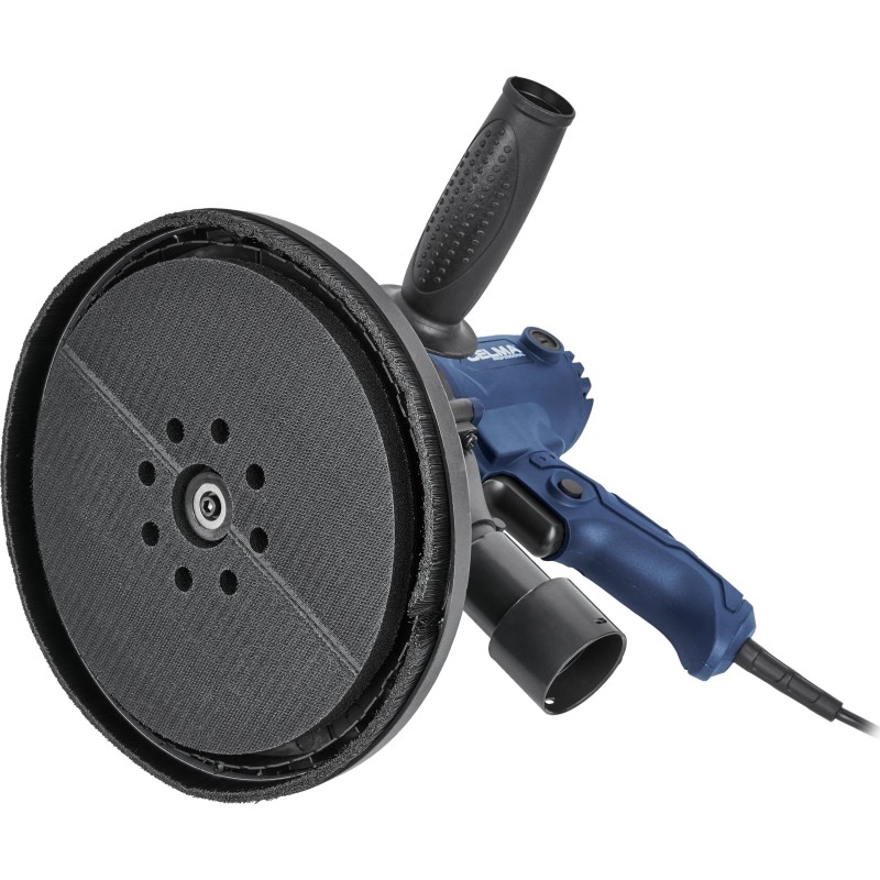 Die Gipsschleifmaschine CELMA Professional PRBs 225GEO ist zum Schleifen von Wänden und Decken aus Gipskartonplatten, Putz und Gipsspachtelmasse, zum Veredeln von Fugen zwischen Gipskartonplatten sowie zum Beseitigen kleiner Unebenheiten auf Putzoberflächen bestimmt. Sie bietet hohen Arbeitskomfort, eine hervorragende Oberflächenqualität und außergewöhnliche Mobilität dank ihres geringen Gewichts, der guten Gewichtsverteilung, der gut angeordneten Griffe sowie des 4 Meter langen Netzkabels. Die stufenlose Drehzahlregelung ermöglicht eine optimale Anpassung der Drehzahl an die jeweilige Arbeitsaufgabe. Das integrierte und leistungsstarke Absaugsystem sowie der im Lieferumfang enthaltene geräumige Staubbeutel ermöglichen das Arbeiten ohne Staubsauger. Um die Effizienz der Staubabsaugung von den bearbeiteten Oberflächen zu erhöhen, wird empfohlen, die Maschine an einen Industriestaubsauger anzuschließen, was durch den im Lieferumfang enthaltenen Adapter ermöglicht wird.
