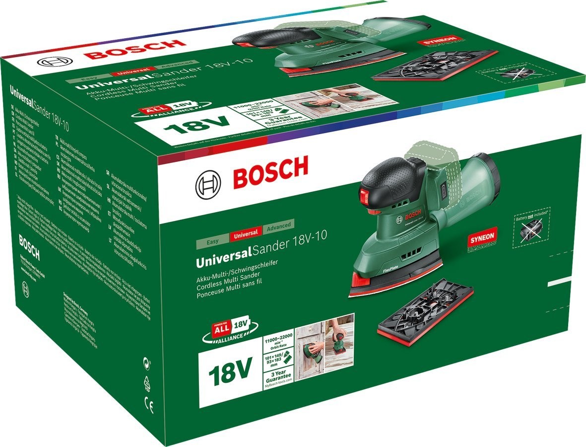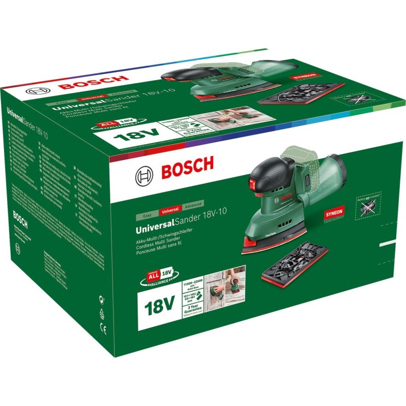 Das Akku-Modell UniversalSander 18V-10 ist mit einer Platte ausgestattet, deren Form an die Sohle eines Bügeleisens erinnert und das Arbeiten in engen Stellen und Ecken ermöglicht, sowie mit einer rechteckigen Platte zum Schleifen mittlerer und größerer ebener Flächen. Die elektronische Drehzahlvorwahl ermöglicht die Einstellung der optimalen Drehzahl für die jeweilige Aufgabe und das Material. Das SDS-System ermöglicht einen schnellen Werkzeugwechsel. Der Schleifer eignet sich ideal für die Bearbeitung von Holz-, lasierten und lackierten Oberflächen, z. B. bei Möbeln, Türen, Rahmen usw. Sein leicht abnehmbarer Staubbehälter mit Mikrofilter sorgt für Sauberkeit am Arbeitsplatz. Die integrierte Bosch Syneon Technology sorgt für optimale Leistung und maximale Laufzeit. Das Werkzeug ist Teil des 18-V-POWER-FOR-ALL-Systems. Ein Akku kann für alle 18-V-POWER-FOR-ALL-Elektrowerkzeuge verwendet werden.