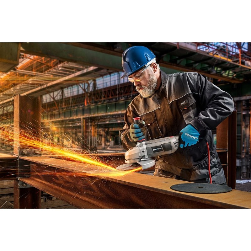 Hochwertiger Winkelschleifer GRAPHITE (Art.-Nr. 59G207) mit einem leistungsstarken 2350-W-Motor, geeignet zum Schneiden, Schleifen und Polieren von Materialien unterschiedlicher Struktur und Härte. Schleifscheibe mit einem Durchmesser von 230 mm. Dank ihrer ergonomischen Form und der präzisen Auswuchtung gewährleistet die Maschine hohen Arbeitskomfort. Der Hauptgriff mit rutschfester Auflage und der Zusatzgriff mit dreistufiger Befestigung sorgen für komfortables Arbeiten für Rechts- und Linkshänder. Aus Sicherheitsgründen ist der Schleifer mit einem Zweistufenschalter ausgestattet, der ein versehentliches Einschalten verhindert, sowie mit einem Spindelarretierungsknopf, der nicht aus dem Gehäuse herausragt. Die geeignete Anordnung der Lüftungsöffnungen schützt vor einer Überhitzung des Motors. Das Getriebegehäuse aus einer Aluminiumlegierung leitet die Wärme hervorragend ab und verstärkt zudem die Konstruktion. Die maximale Drehzahl des Schleifkopfes beträgt 6500 Umdrehungen pro Minute. Die Bürsten können von außen selbstständig ausgetauscht werden. Das Gerät ist mit einem flexiblen und robusten, 3 m langen Netzkabel mit Gummimantel ausgestattet, das auch für professionelle und industrielle Anwendungen im Innen- und Außenbereich geeignet ist. Die Konformität mit den europäischen Normen wird durch das CE-Zertifikat gewährleistet.