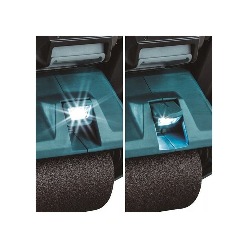 Die doppelten LED-Leuchten der Schleifmaschine MAKITA BS001GZ beleuchten den Arbeitsbereich und ermöglichen so präzises Schleifen auch an schlecht beleuchteten Stellen. Der Neigungswinkel lässt sich im Bereich von 15° bis 30° einstellen, was die Funktionalität des Werkzeugs erhöht.