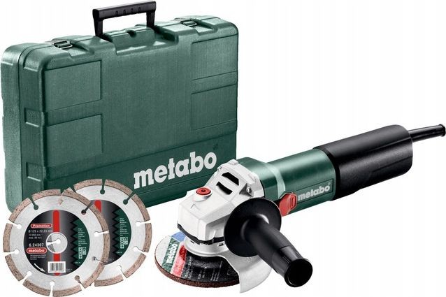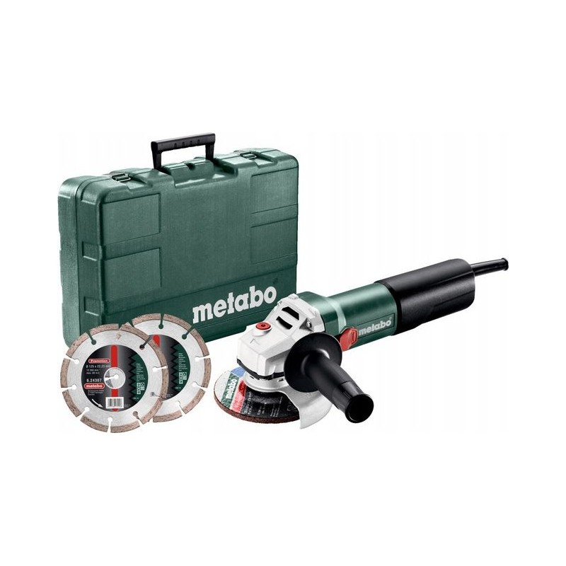 Der netzbetriebene Winkelschleifer WQ 1100-125 SET Metabo 610035510 ist ein umfangreiches Set, bestehend aus einem universellen Winkelschleifer mit zwei Diamantscheiben zum Schneiden von Baumaterialien sowie einem Transportkoffer. Der 1100-W-Schleifer bewältigt die meisten Arbeiten beim Schleifen von Metallen, Holz, Keramik und Beton. Der überlastfeste Motor und die an der Oberseite des Gehäuses angeordneten Lufteinlässe ermöglichen das intensive Schneiden von Beton, Dachziegeln und Keramik. Der Werkzeugwechsel erfolgt werkzeuglos über das Metabo Quick-System, bei dem die SDS-Mutter durch Drücken der Spindelarretierung bei niedriger Drehzahl gelöst wird. Für die Sicherheit des Anwenders sorgt die schnellste Schutzvorrichtung gegen das Festfressen der Scheibe – Metabo S-automatic. Eine mechanische Kupplung trennt den Antrieb vom Werkzeug, wodurch ein Rückstoß minimiert und eine schnelle Wiederaufnahme der Arbeit gewährleistet wird. Die Wiederanlaufsperre schützt den Bediener vor einem selbstständigen Anlaufen des Motors, wenn die Stromversorgung der Maschine bei gedrücktem Schalter wiederhergestellt wird. Die Sägeblattabdeckung verfügt über spezielle Vorsprünge, die ein Verschieben ohne Eingreifen des Benutzers verhindern. Die Metabo-Gummischleifscheibe der Economy-Klasse vereint bewährte Technologien des deutschen Elektrowerkzeugherstellers mit dem günstigen Preis von Geräten der unteren Preisklasse.