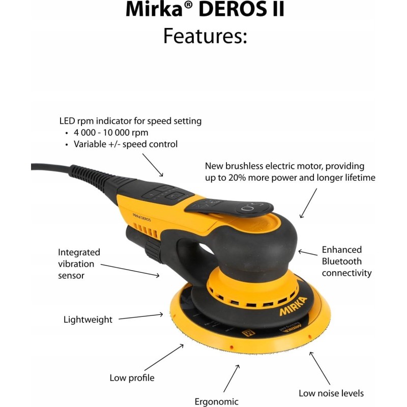 • Die wichtigsten technischen Merkmale des DEROS II 5650: Schleifteller mit Ø 125 mm und Ø 150 mm, 5,0 mm Hub, geringe Vibrationen und leiser Betrieb, leistungsstarker Elektromotor, Gewicht von nur 1 kg, flache Bauweise (nur 10 cm hoch), moderner bürstenloser Motor, Drehzahlregler, LED-Drehzahlanzeige, integrierter Vibrationssensor und Bluetooth-Verbindung zur myMirka-App