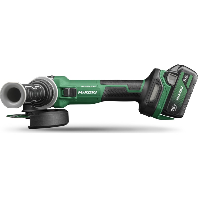 Hikoki G1813DE WQZ. Produktfarbe: Schwarz, Grün, Grau, Motor: Bürstenloser Motor, Schutzfunktionen: Überladeschutz. Scheibendurchmesser der Schleifmaschine: 12,5 cm, Leerlaufdrehzahl (max.): 8000 U/min, Schallleistungspegel: 96 dB. Stromquelle: Akku, Akkutechnologie: Lithium-Ionen (Li-Ion), Akkukapazität: 5 Ah. Produktgewicht: 3 kg, Produktlänge: 389 mm. Anzahl der enthaltenen Akkus: 2 Stück.