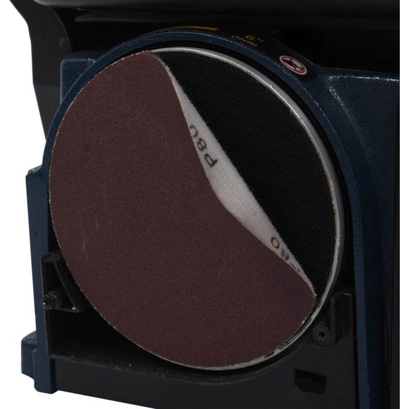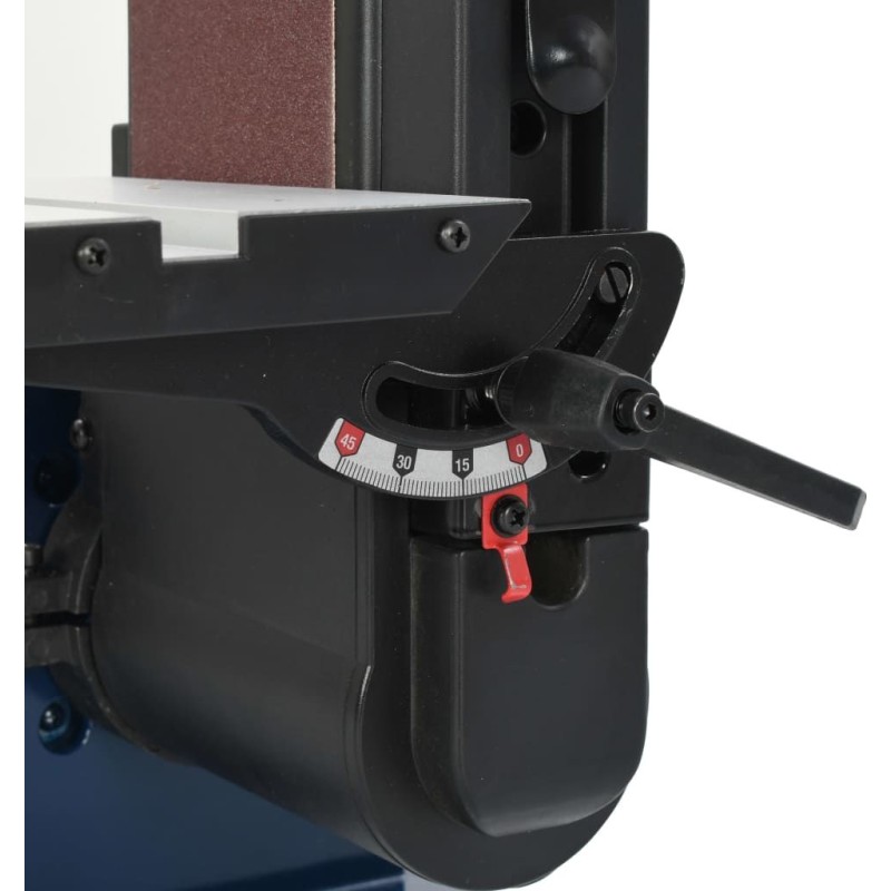 Die Schleifmaschine ist mit einem neigbaren Schleifband ausgestattet, das vertikal, horizontal oder in jedem beliebigen Winkel dazwischen verwendet werden kann. Die Arbeitsplatte für die Schleifscheibe lässt sich ebenfalls in jedem beliebigen Winkel bis zu 45° neigen. Dank der Klettverschlüsse lässt sich das Schleifpapier leicht befestigen oder austauschen. Zusätzlich ist die Schleifmaschine mit einer Messvorrichtung für präzises Winkelschleifen ausgestattet.