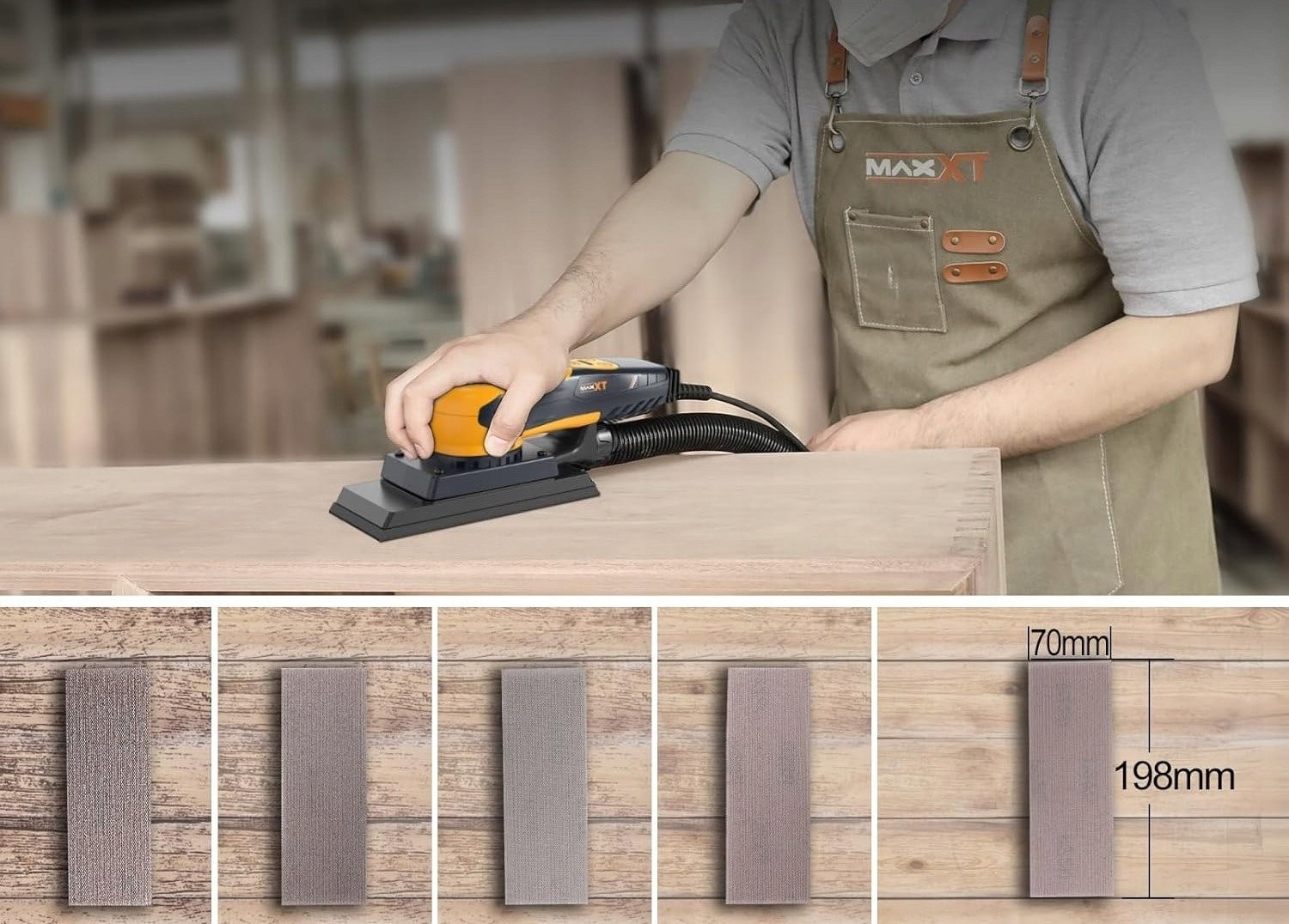 Die quadratische Schleifscheibe mit den Maßen 198 x 70 mm ermöglicht das effektive Schleifen verschiedener Oberflächen und ist damit ein hervorragendes Werkzeug für die Holzbearbeitung. So erreichen Sie mühelos schwer zugängliche Stellen und erzielen ein glattes Finish.