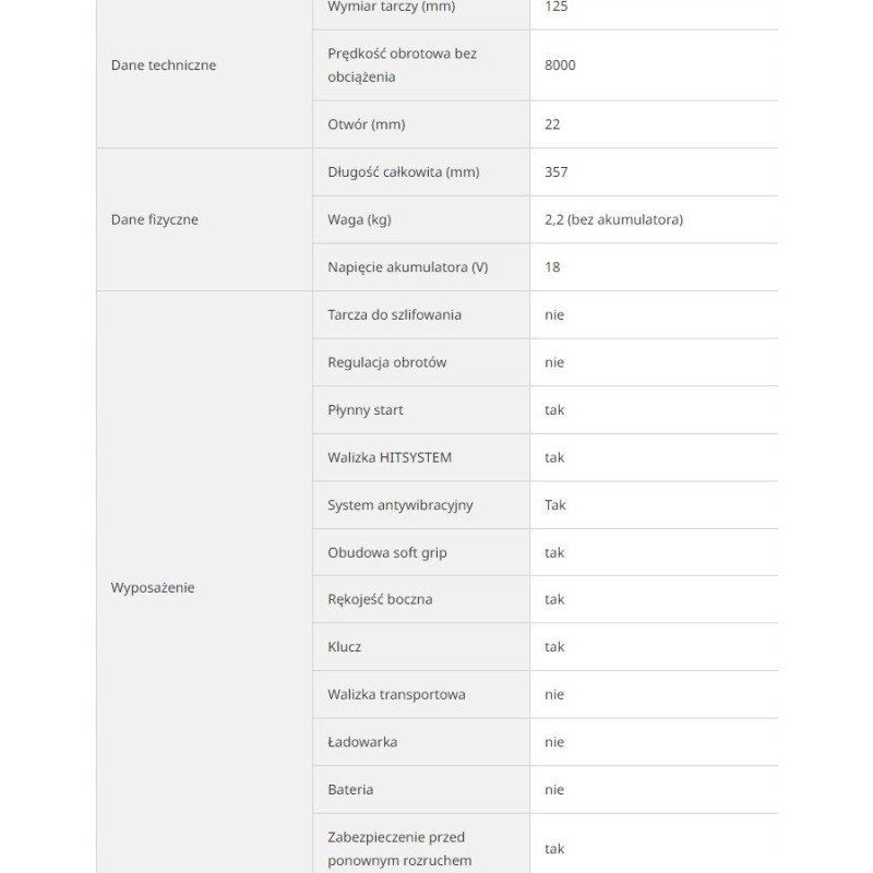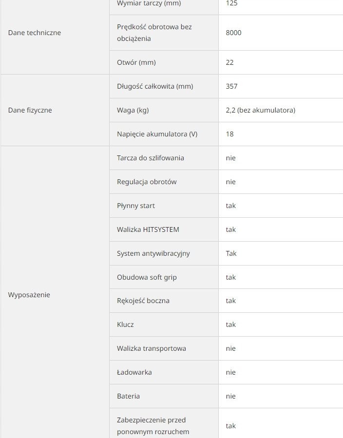 Im Lieferumfang des Schleifers sind ein vibrationsdämpfender Seitengriff, eine Scheibenschutzhaube, eine Mutter und ein Schlüssel für die Scheibe sowie ein HITSYSTEM-Koffer enthalten. Das ist alles, was Sie benötigen, um sofort nach dem Kauf mit der Arbeit zu beginnen.