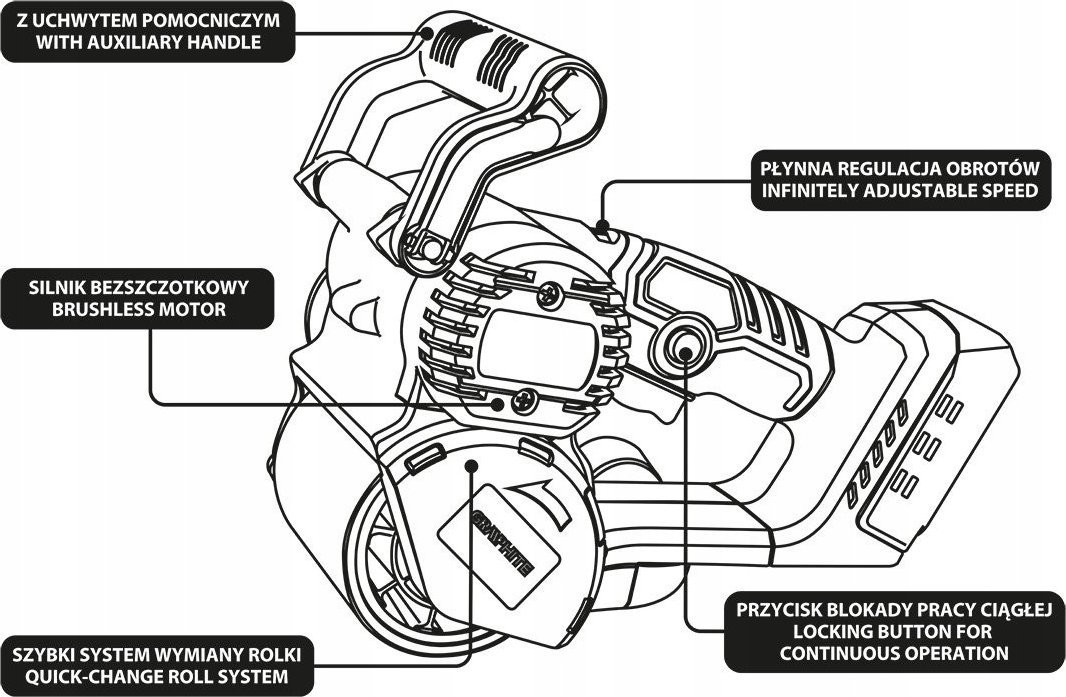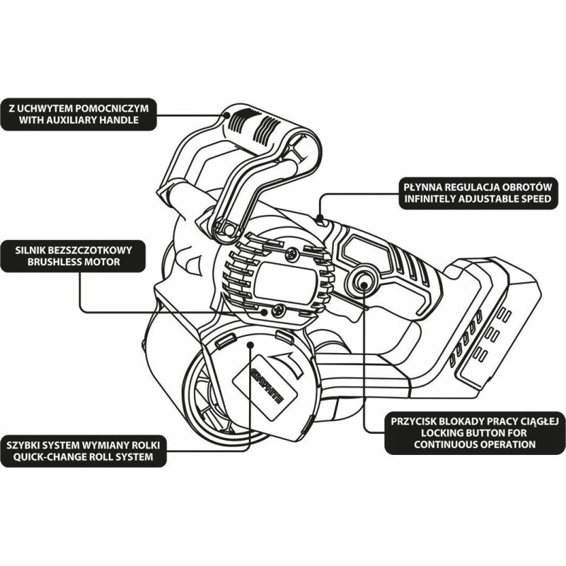 Der Akku-Schleifer Energy+ 18 V 58GE137 der Marke GRAPHITE ist ein Werkzeug aus dem Energy+-Akkusystem. Eine multifunktionale Poliermaschine, die mit einer Spannung von 18 V betrieben wird. Sie zeichnet sich durch eine Leerlaufdrehzahl von 1500 – 3300 Umdrehungen pro Minute sowie eine Drehzahlregelung aus. Sie verfügt über eine Scheibe in der Größe 100 x 80 mm. Ausgestattet mit einem bürstenlosen, robusten Motor. Schleifmaschine mit Zusatzgriff und Softgriff für komfortable Handhabung. Sie gewährleistet eine einfache Bedienung dank werkzeuglosem Werkzeugwechsel. Die Laufzeit im Leerlauf hängt vom verwendeten Akku ab: 2 Ah – 15 Minuten Betriebszeit, 4 Ah – 31 Minuten oder 6 Ah – 51 Minuten. Das Werkzeug kann zum Entfernen von Belägen, Kratzern und überschüssigem Material, zum Ausbessern von Oberflächenfehlern, zum Reinigen mit Bürsten, zum Satinieren oder zum Strukturieren von Oberflächen verwendet werden. Je nach verwendetem Walzenaufsatz lassen sich unterschiedliche Bearbeitungseffekte erzielen – darunter auch Hochglanz. Die Schleifmaschine der Marke GRAPHITE wird für Profis und Heimwerker empfohlen. Im Set mit Schleifpapier und Walze erhältlich.