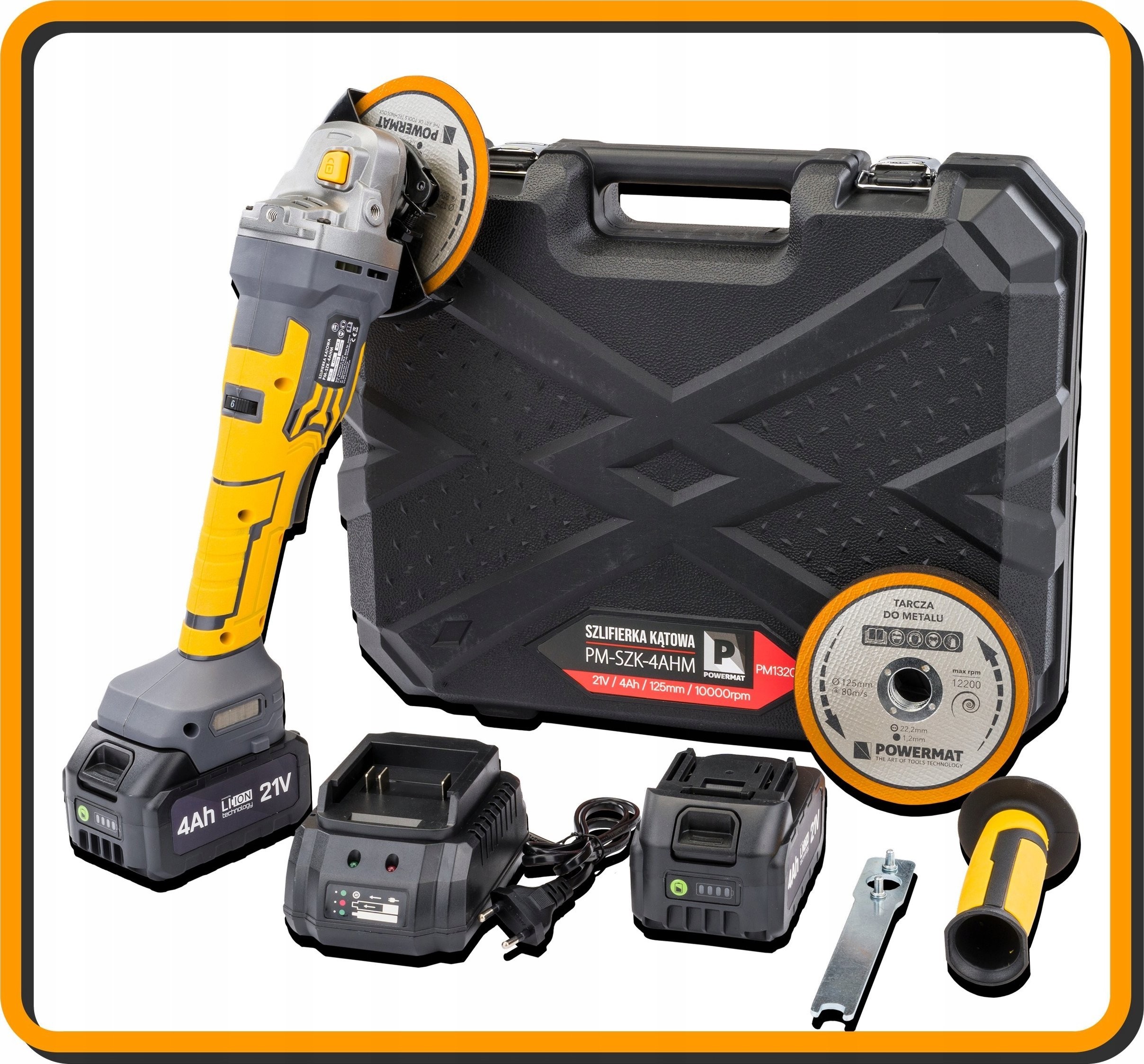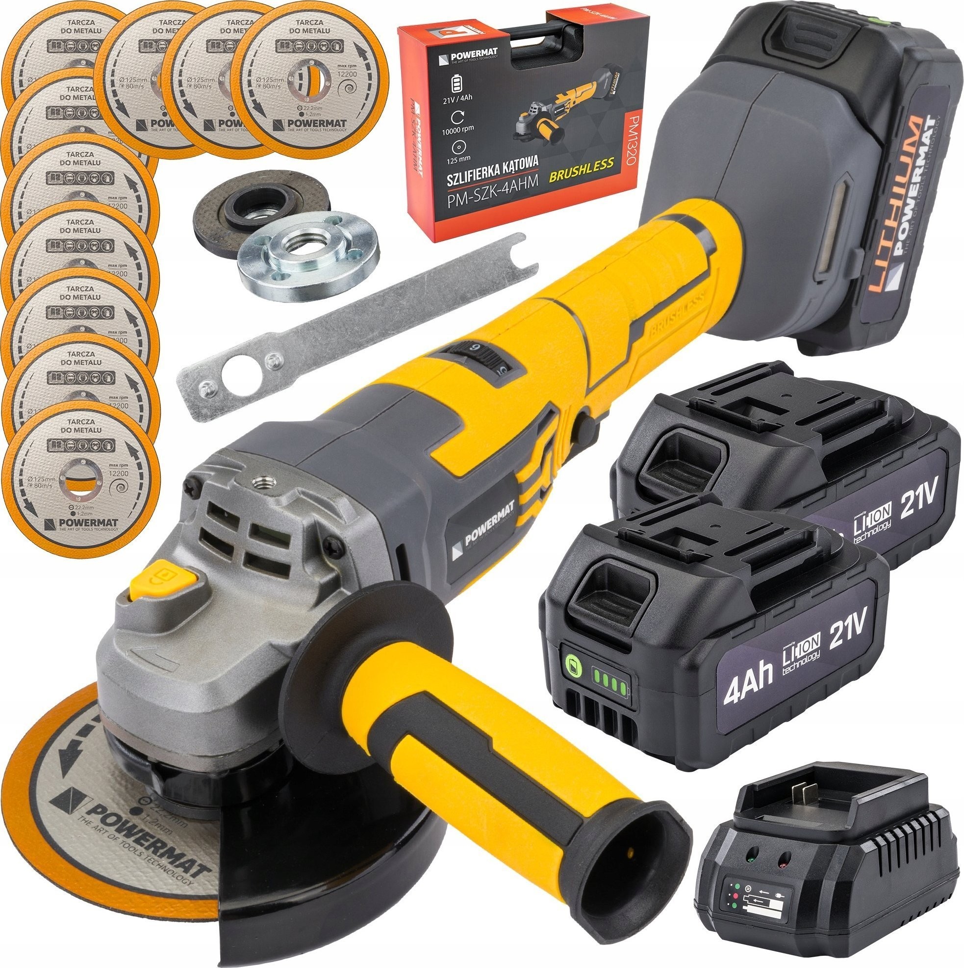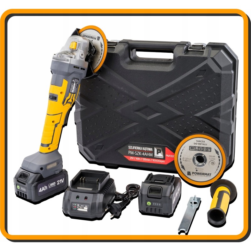 Das Set enthält den Powermat-Winkelschleifer, 10 Stück Korundscheiben für Metall, einen Schlüssel zum Lösen der Scheibe, ein Schnellladegerät sowie eine Bedienungsanleitung in Polnisch und Englisch. Es handelt sich um eine umfassende Lösung, die den Anforderungen jedes Anwenders gerecht wird.