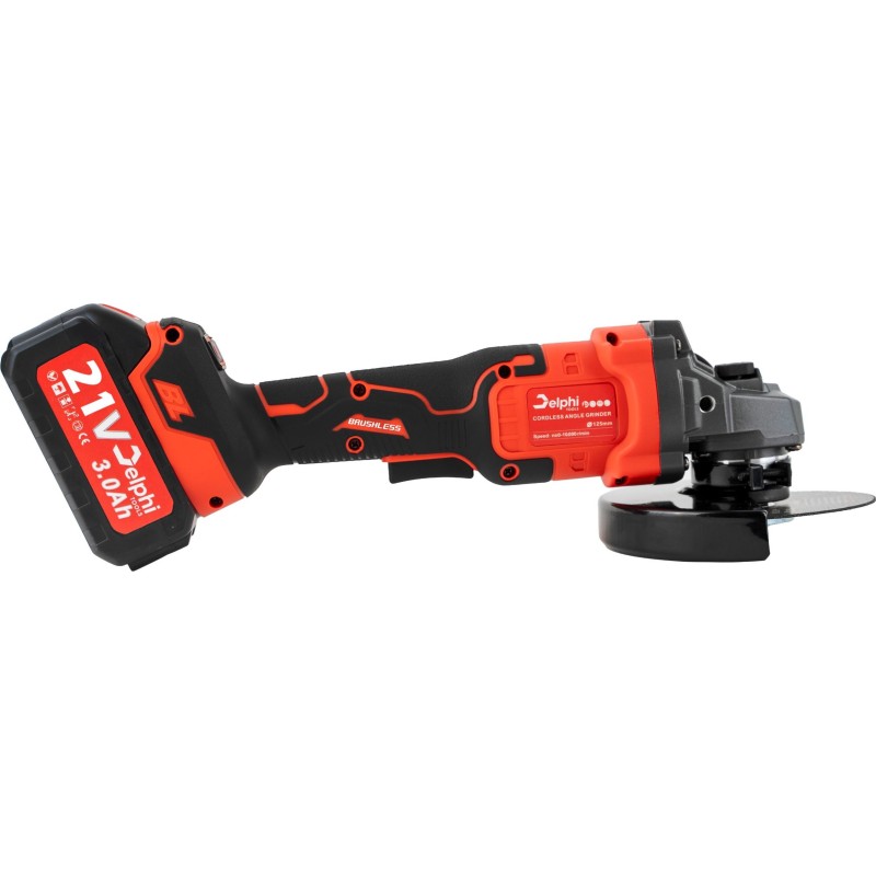 Schleifmaschine von Delphi Tools – bürstenloser Akku-Winkelschleifer mit Gummipolster, 2 Akkus