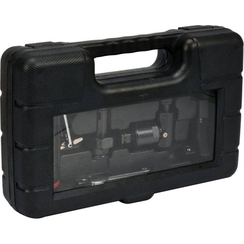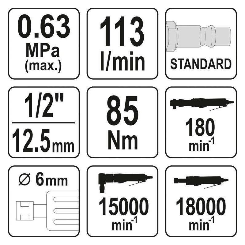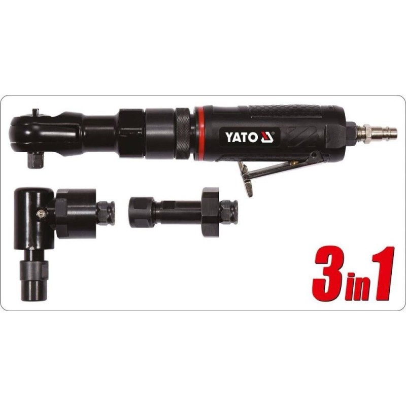 universelle 3-in-1-Druckluftwerkzeug mit austauschbaren Aufsätzen vereint die Funktionen eines 1/2"-Ratschenschraubers, eines Geradschleifers und eines Winkelschleifers mit 6-mm-Aufnahme.