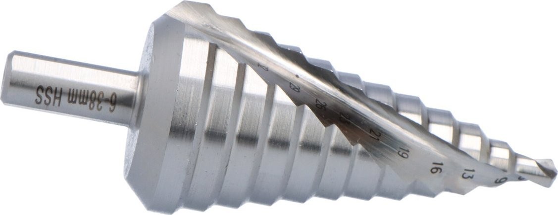 Hergestellt aus Schnellarbeitsstahl. Gewährleistet Bohren ohne Verformung der Bleche. Lasergeschnittene Spirale. Hohe Genauigkeit. Skala auf dem Bohrer angegeben. 2 Schneidkanten. Ausführung: geschliffen. Bohren in Stahl, Stahlblechen, Kunststoffen.