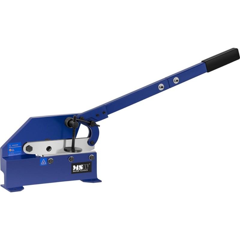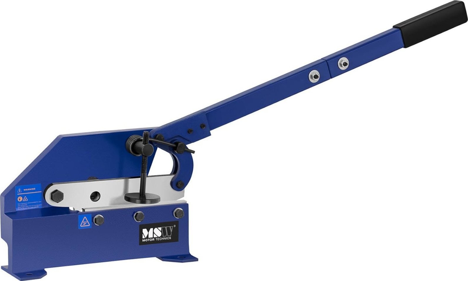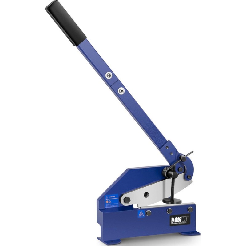 Die Guillotine-Schere der Marke MSW ermöglicht das Schneiden von Werkstücken aus Kunststoff und Metall (Blech, Stangen, Draht). Die beiden hochwertigen Klingen bestehen aus strapazierfähigem T10-Stahl, der sich durch hohe Abriebfestigkeit auszeichnet. Sie ermöglichen die präzise Bearbeitung von Material mit einer maximalen Dicke von 6 mm. Die 170 mm breite Schnittfläche ermöglicht das Schneiden von Blechen unterschiedlicher Größe. Der lange Hebel mit rutschfester Gummibeschichtung sorgt für eine komfortable Bedienung. Die Schneidemaschine kann für mehr Stabilität am Boden befestigt werden.